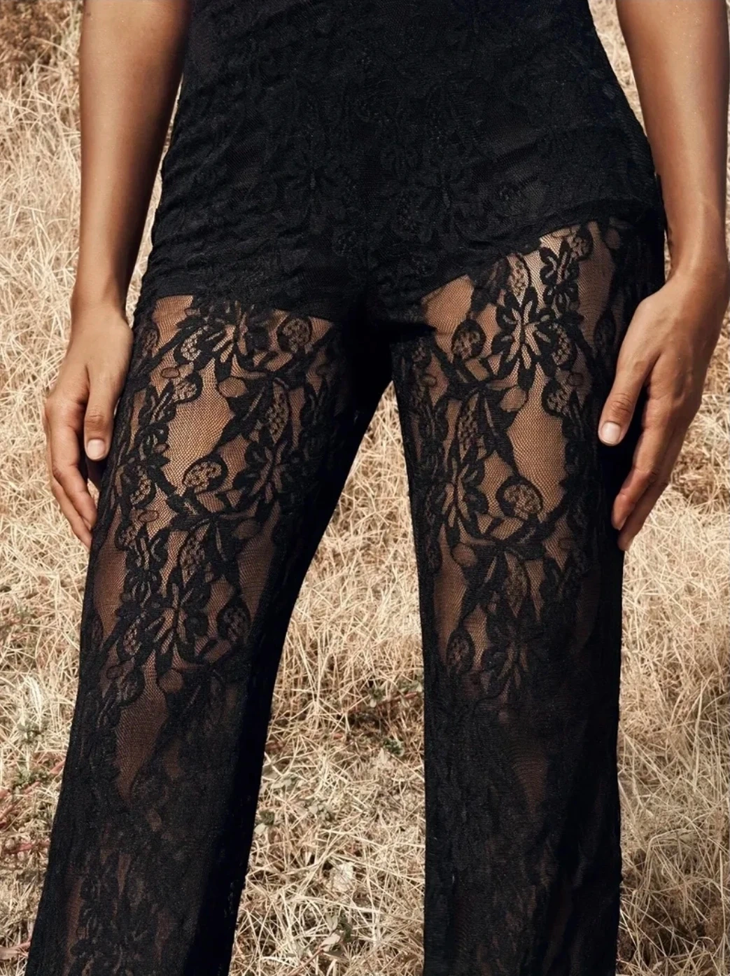 These black lace bell bottom pants are made of sheer lace material. They feature a high-waisted fit and flare leg design. Inseam is approximately 29.6 inches.