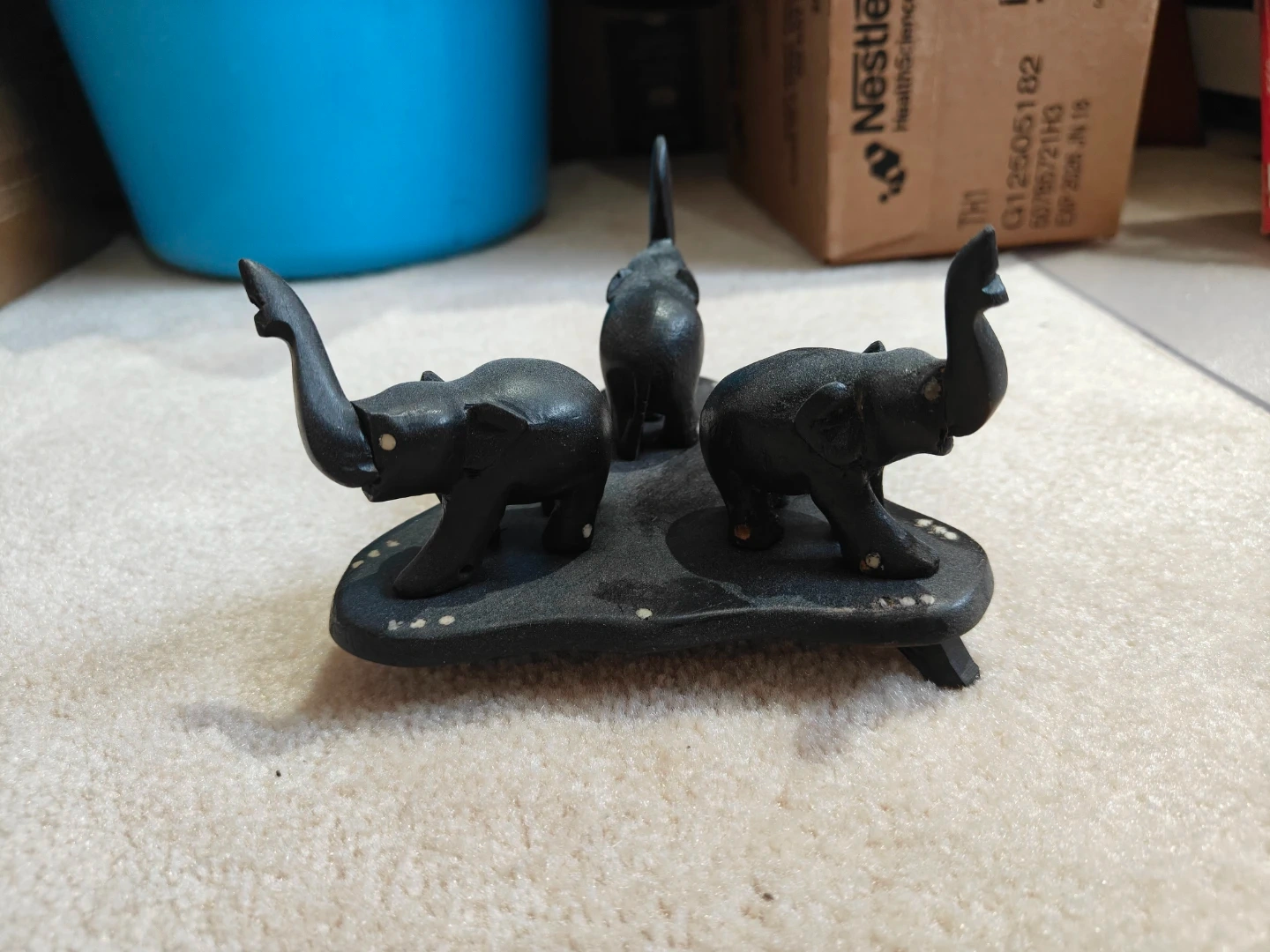 A decorative set featuring three carved wooden elephants on a stand. It's a dark wood finish with small white inlays. This piece adds a touch of charm to any display area.