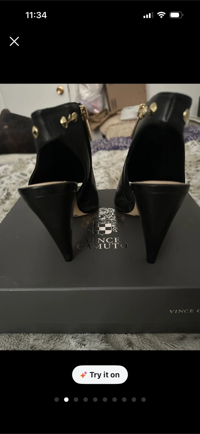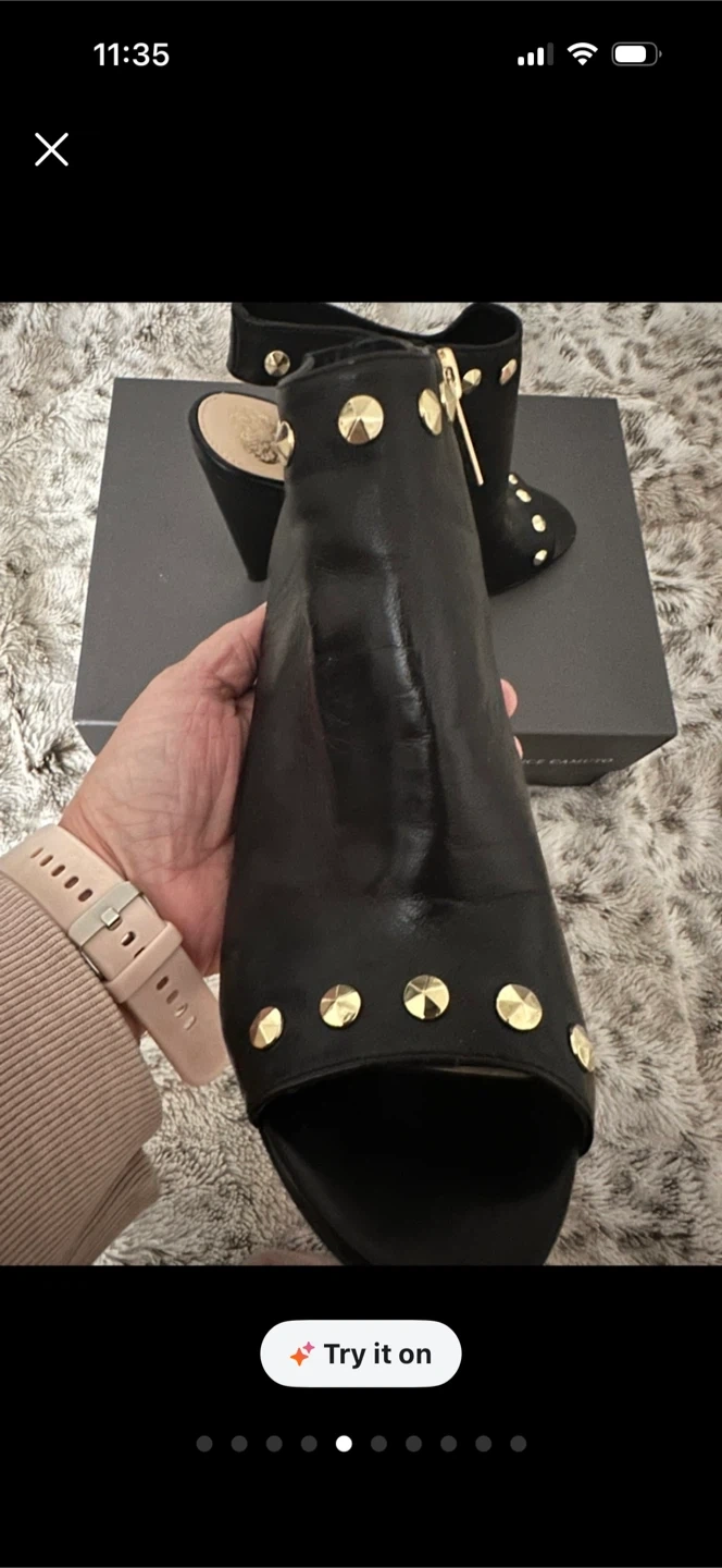 Vince Camuto black leather peep-toe heels with gold stud details. Side zipper closure for easy wear. Comes with original box. Worn only a couple times, shoes are in near mint condition, zippers functional, no rips in the leather gold hardware has no tarnishing. Smoke free home.