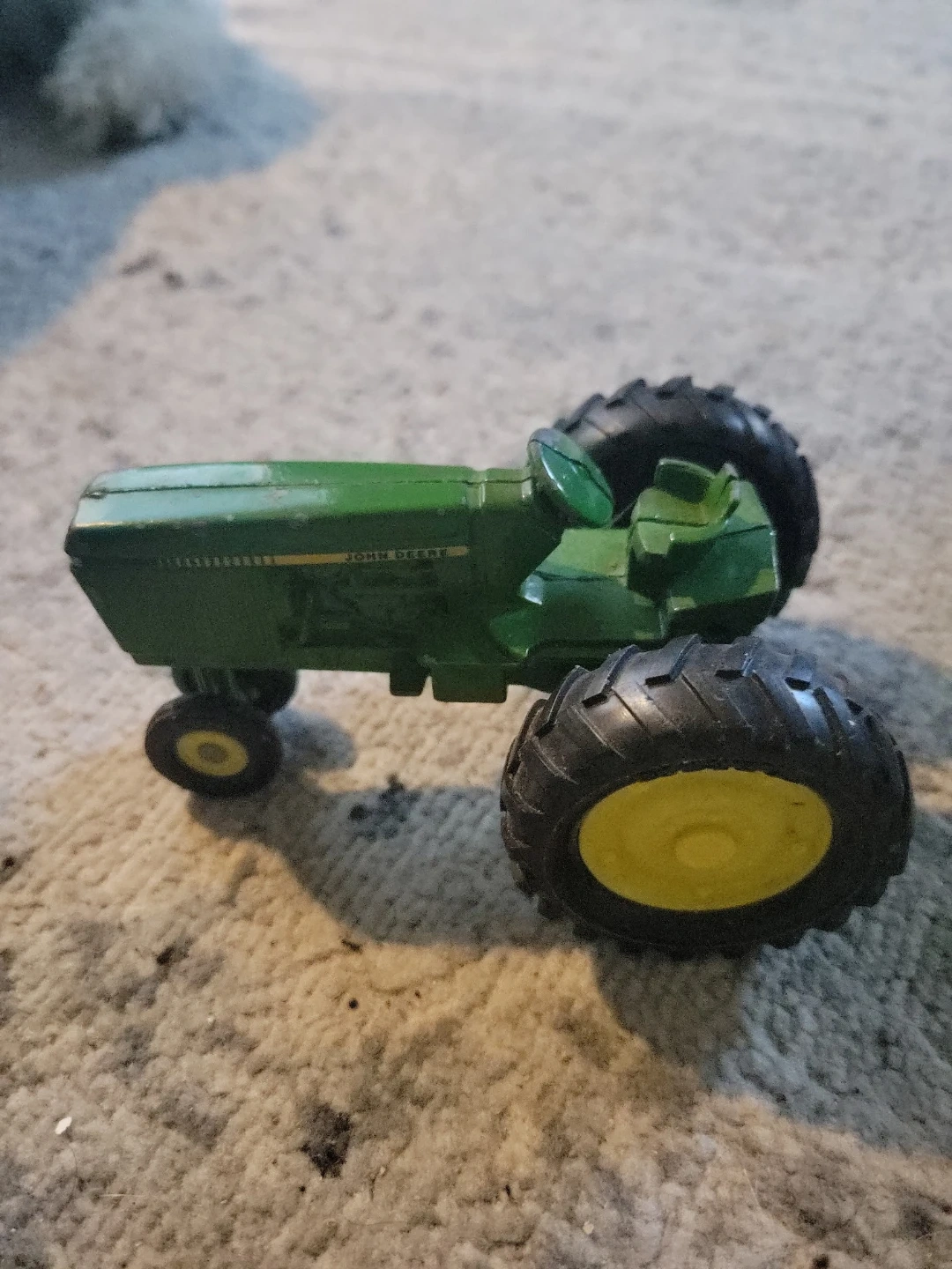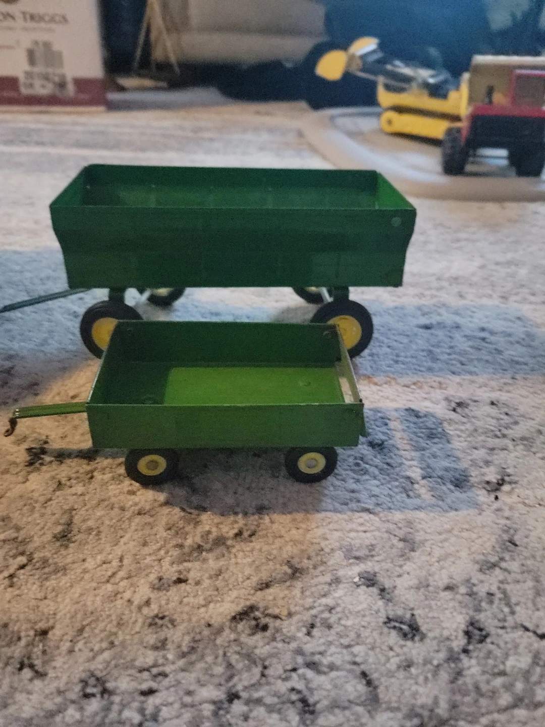 This is a set of John Deere toy farm equipment. It includes a green tractor with yellow wheels and two green wagons. They're made of metal and look like they've seen some fun times!