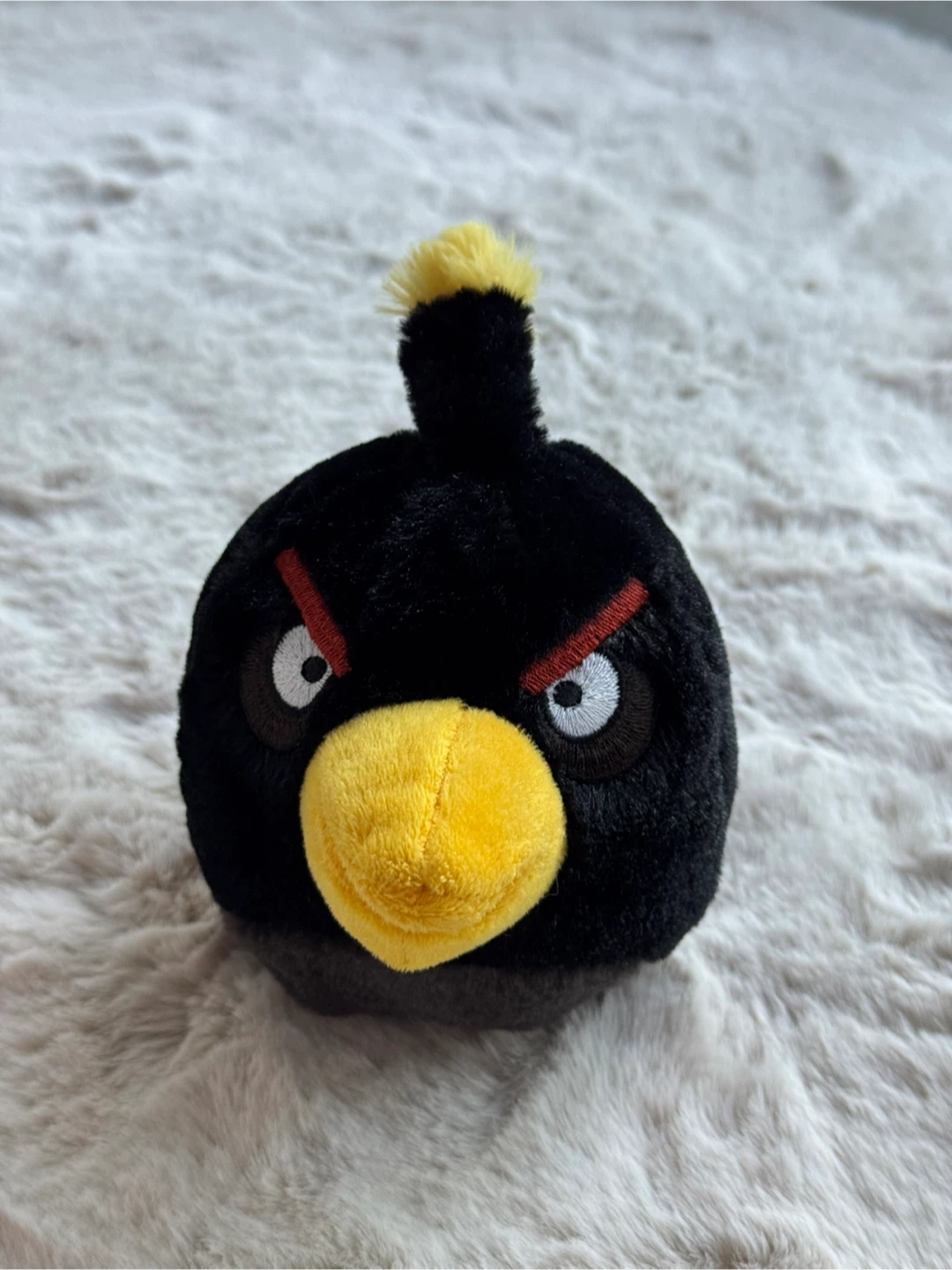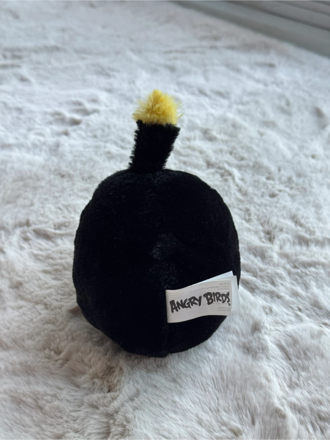 This is a plush toy of the Black Bird (or Bomb Bird) character from Angry Birds. It's soft and huggable!