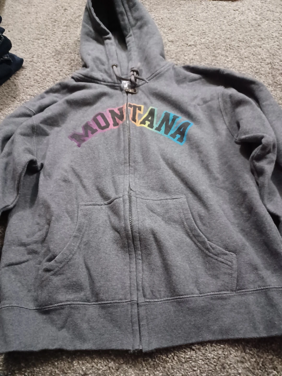Grey zip-up hoodie with "MONTANA" text across the chest in a rainbow gradient. This hoodie is a size large and made from a cotton/polyester blend. Machine washable.