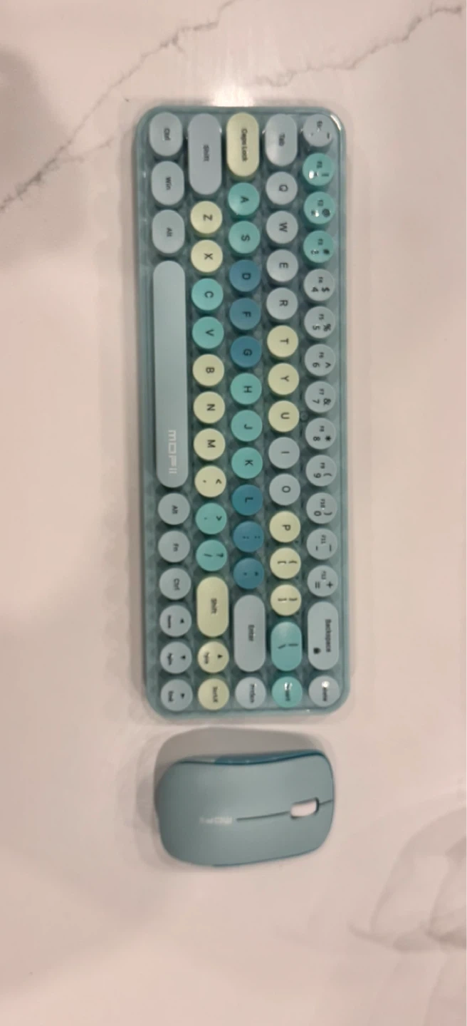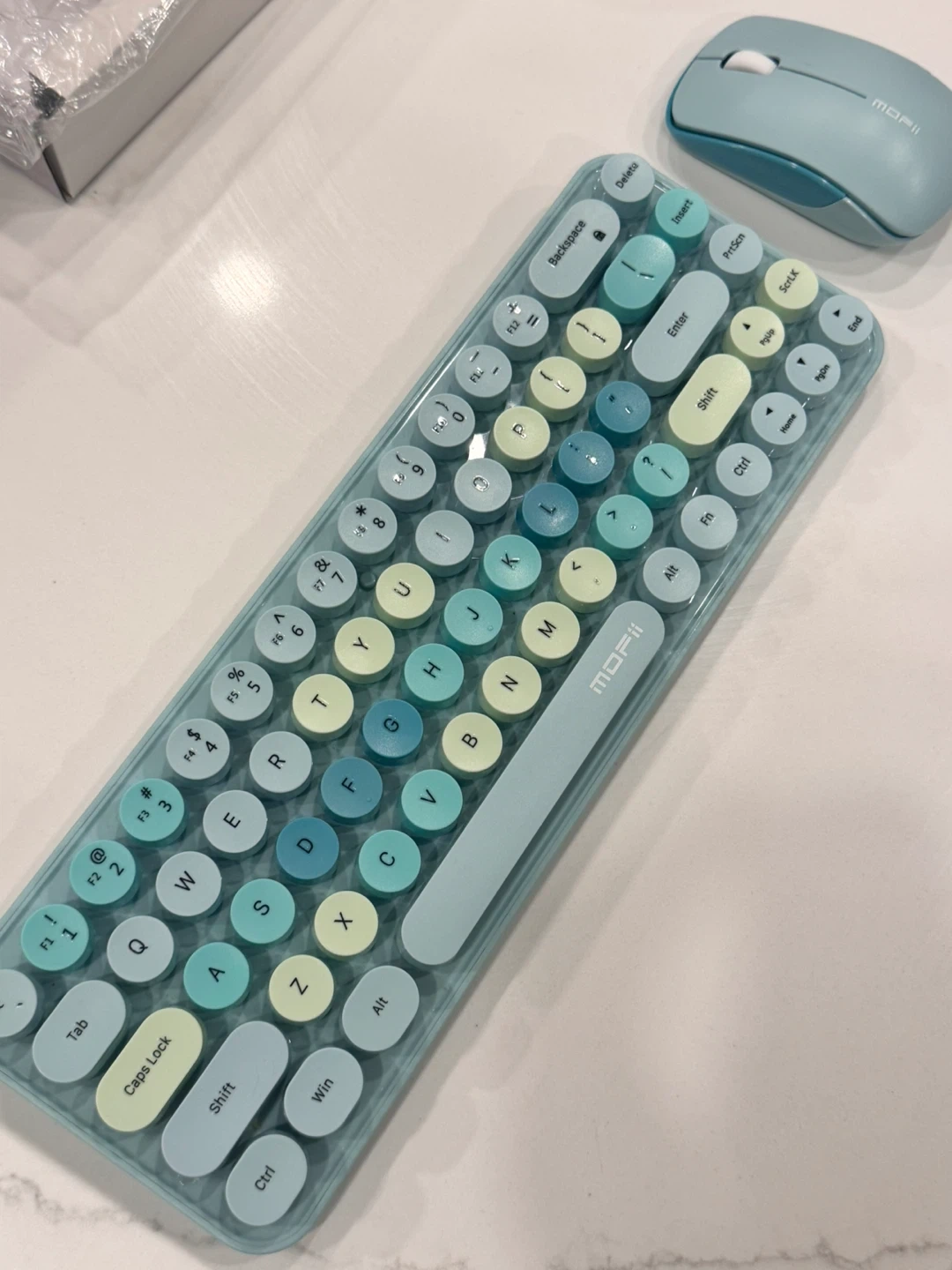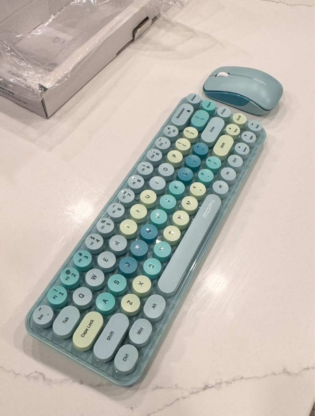 This is a MOFII wireless keyboard and mouse set. It comes in a pastel blue and green colourway with round, retro-style keys. The set includes the keyboard and a matching mouse. It's great for adding a bit of fun to your workspace! Batteries included!