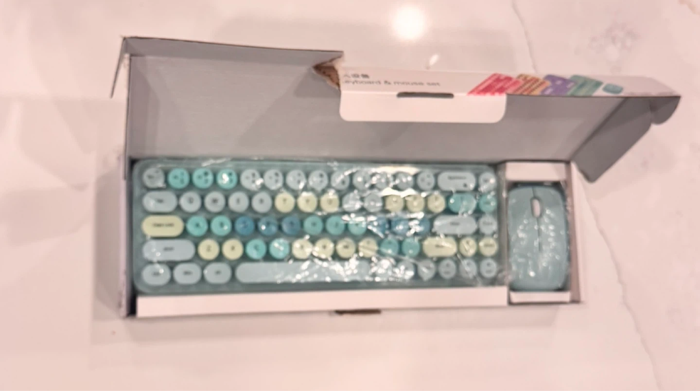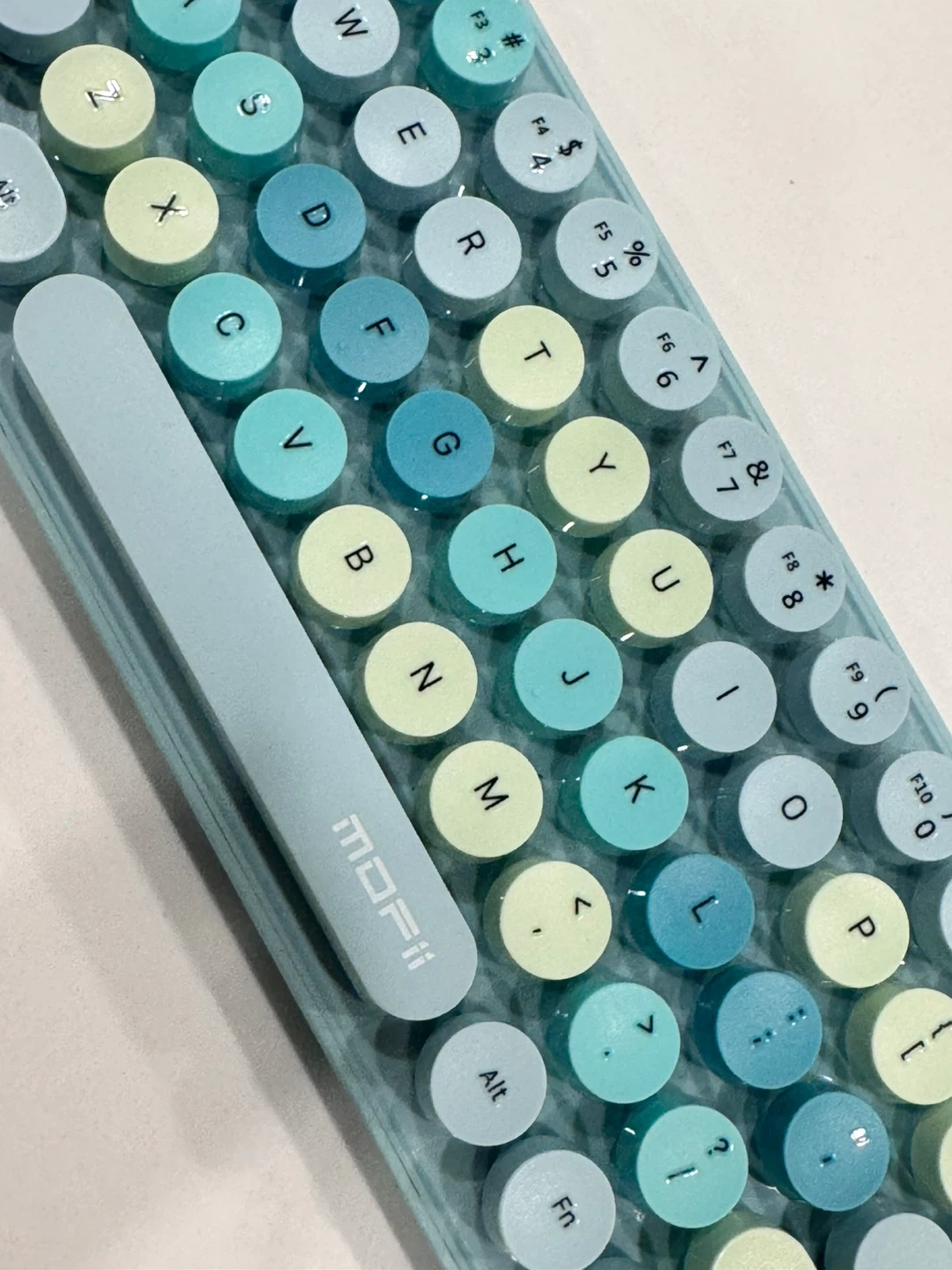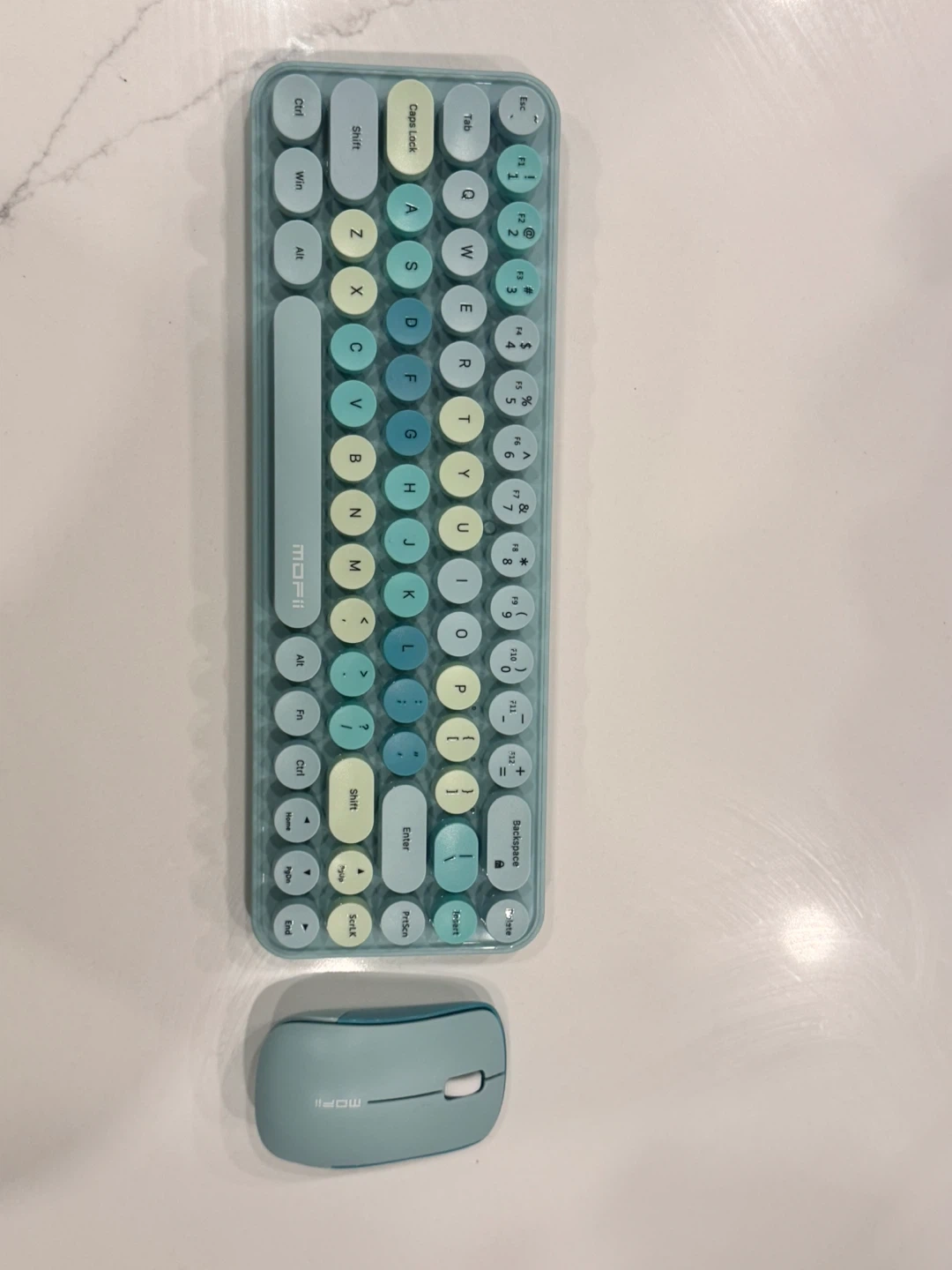 This is a MOFII wireless keyboard and mouse set. It comes in a pastel blue and green colourway with round, retro-style keys. The set includes the keyboard and a matching mouse. It's great for adding a bit of fun to your workspace! Batteries included!
