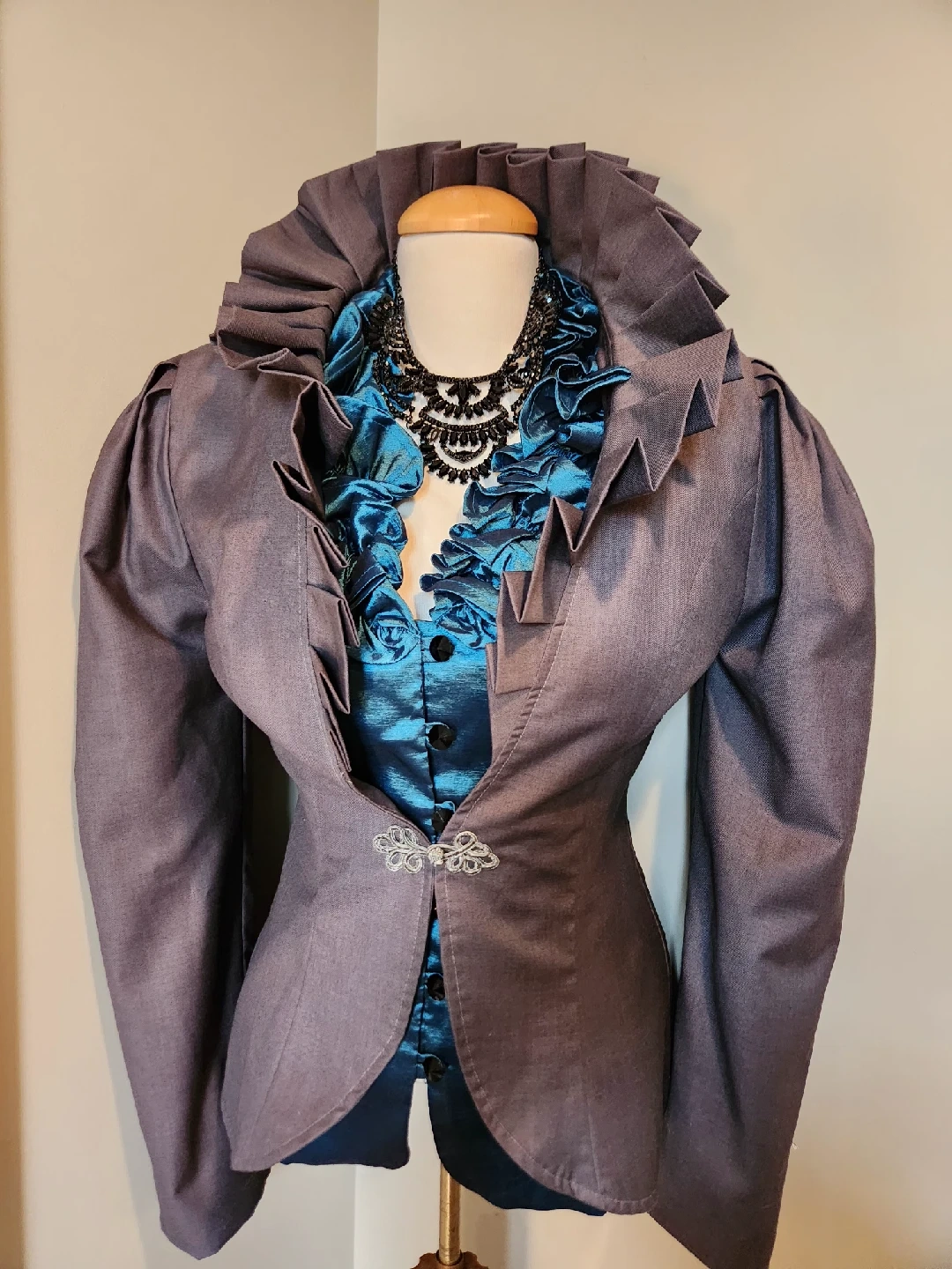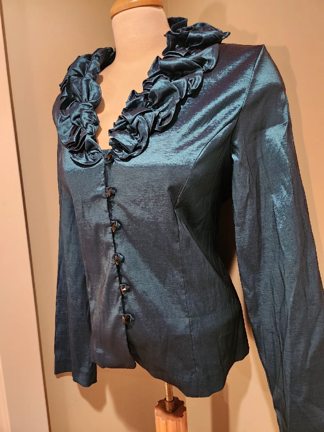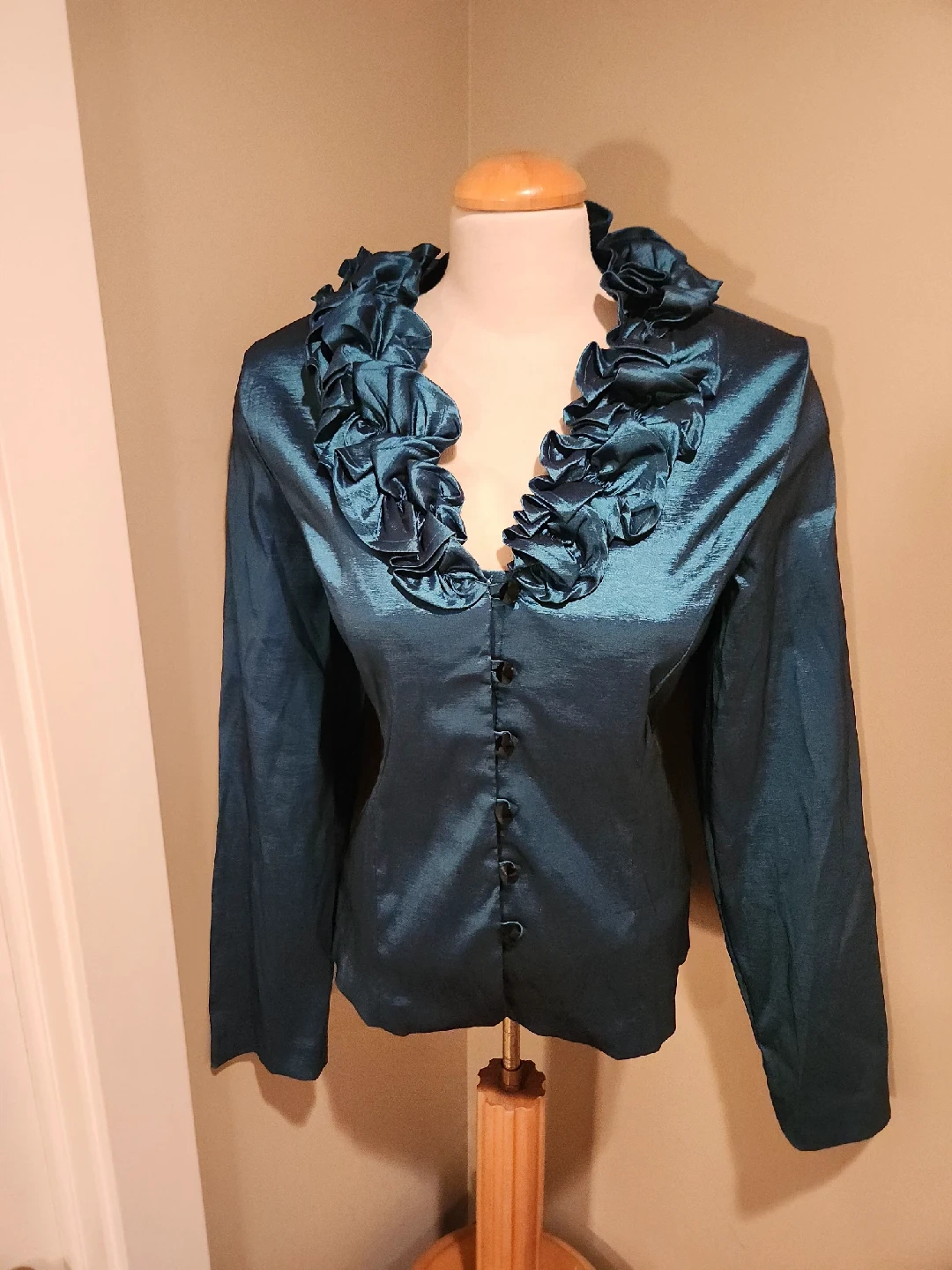 Check out this unique teal colored blouse with a ruffled neckline! It's in great condition and has a very distinctive look. Fits small medium has long sleeves and button-up closure. It's perfect for adding a touch of elegance to ANY outfit.