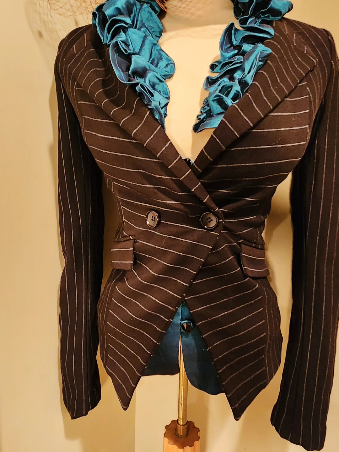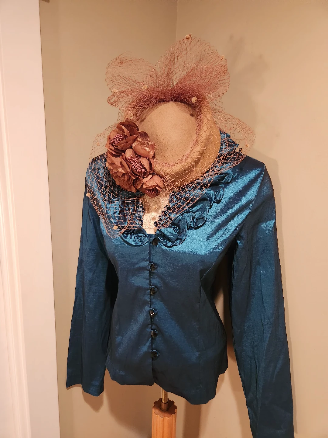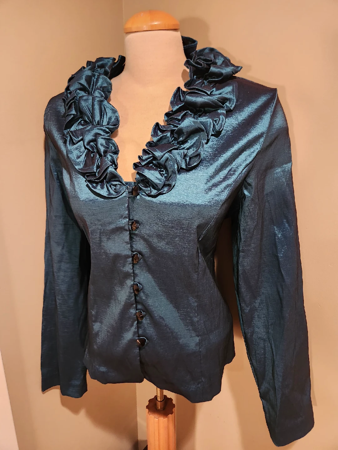 Check out this unique teal colored blouse with a ruffled neckline! It's in great condition and has a very distinctive look. Fits small medium has long sleeves and button-up closure. It's perfect for adding a touch of elegance to ANY outfit.