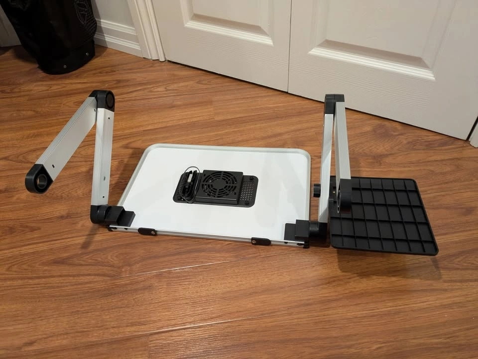 Used in the spare office room for about a year. Adjustable heights with the mouse tray and the USB fan. No dent or scratches. 10.5" depth, 16" width for the laptop tray, 25.5" with the arms and mouse tray. Pick up Mississauga, Glen Erin and Britannia. Smoke-free and Pet-free house. If the ad is up, it is available.