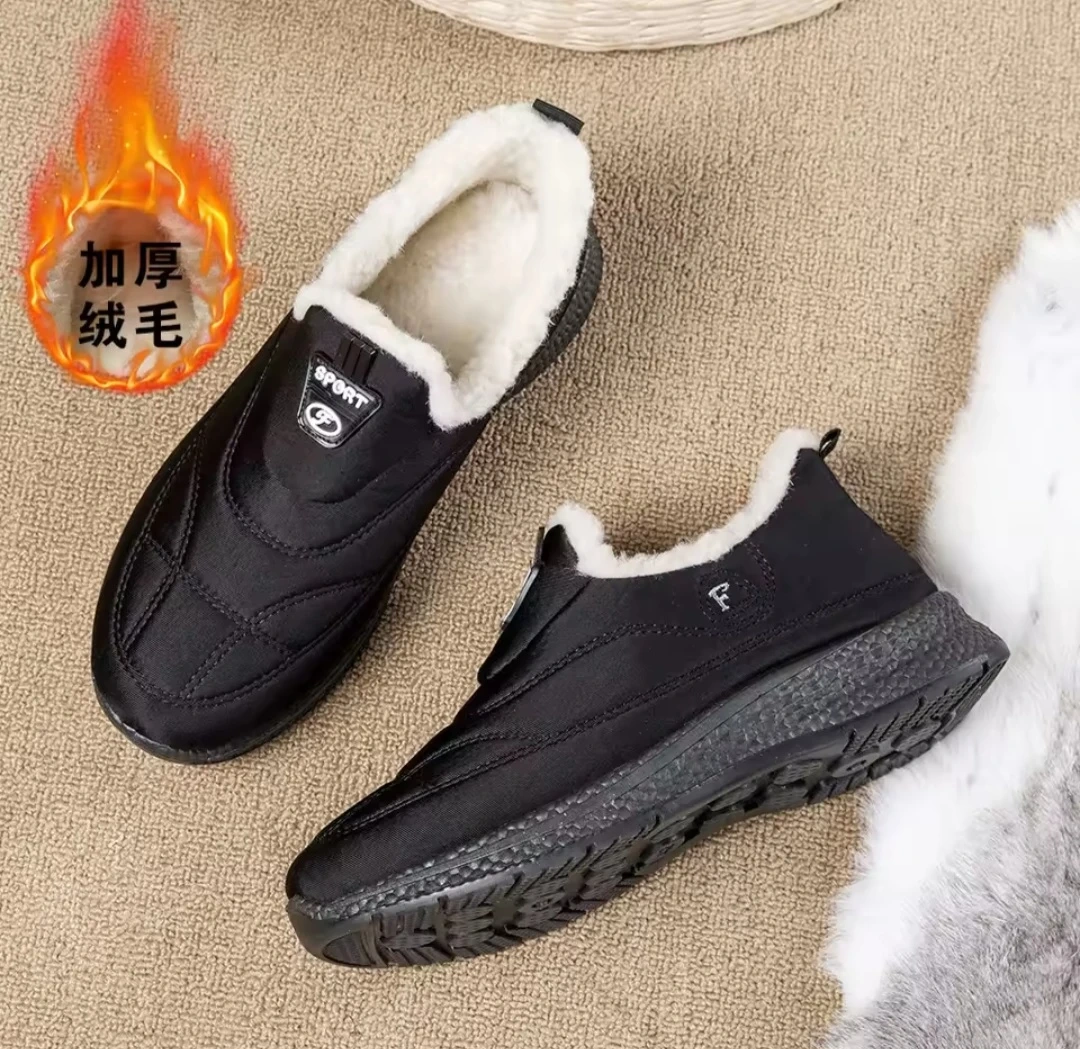 Cozy black slip-on shoes with a warm sherpa lining. They're perfect for keeping your feet toasty during colder months. The outer material is water-resistant nylon with a durable sole.