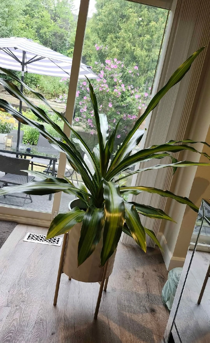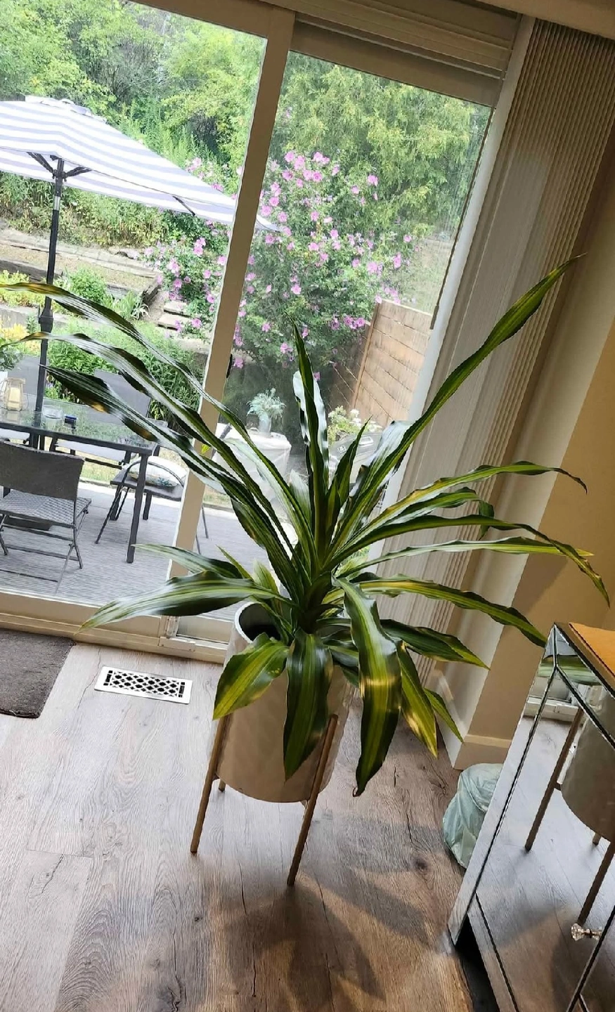 Large Dracaena Plant PRICED TO SELL @ $30 or nearest offer! Beautifully matured in healthy condition, but does have some minor yellow spots on lower leaves due to dry air conditions. Nothing a little TLC can't fix with some regular spraying of leaves for added humidity. This is a great statement piece if you have some space to fill - Approx. 4.5 ft wide x 4.5 ft high. Pickup close to Bathurst & Steeles corridor off New Westminster in Thornhill/North York. [White Planter Stand Not Included; comes with a black PVC planter stand on floor].