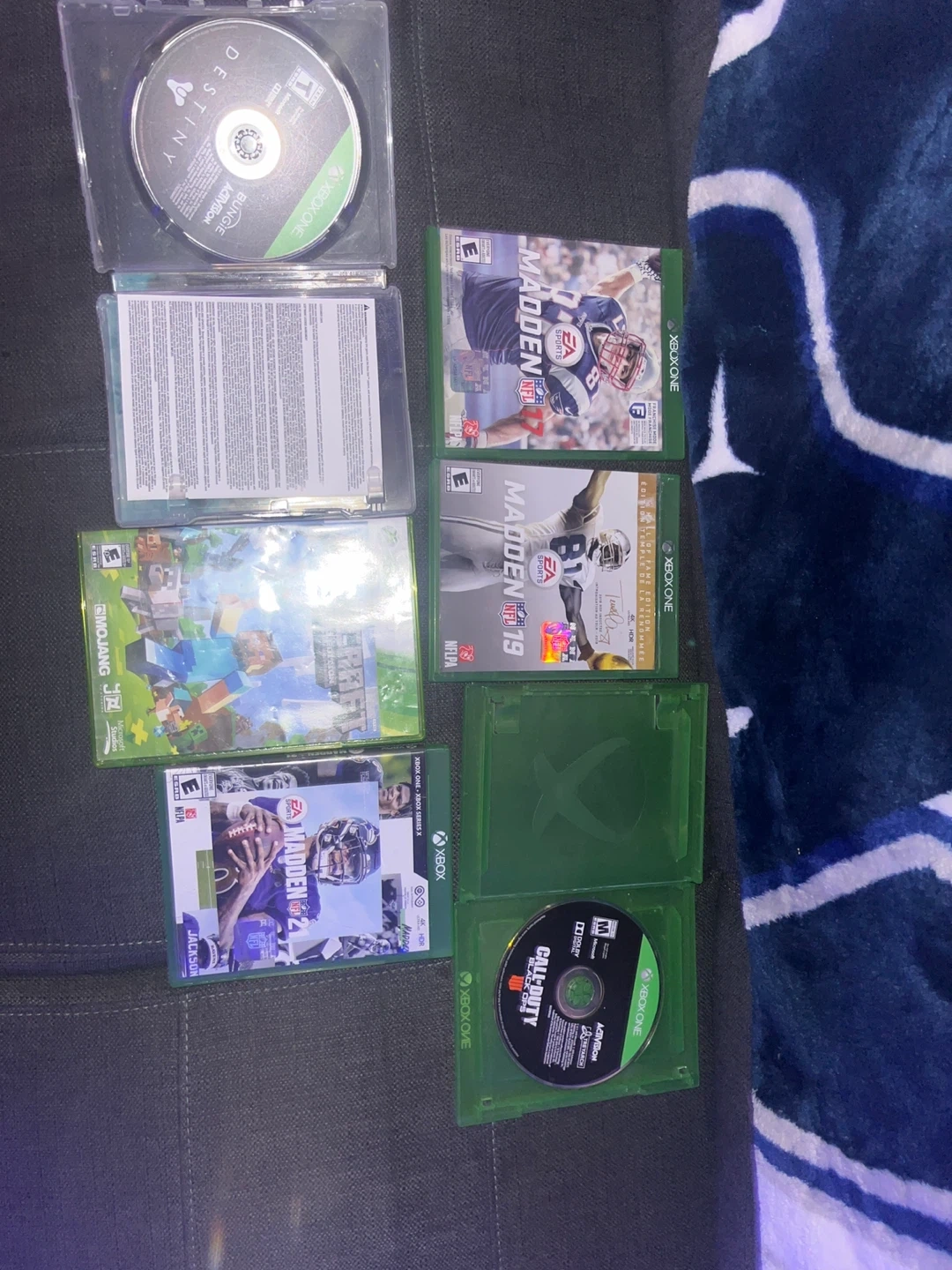 Collection of Xbox One video games including Destiny, Madden NFL 21, Madden 19, Minecraft, and Call of Duty Black Ops 4. All discs are for Xbox One or Xbox Series X/S. Cases included for most titles.
