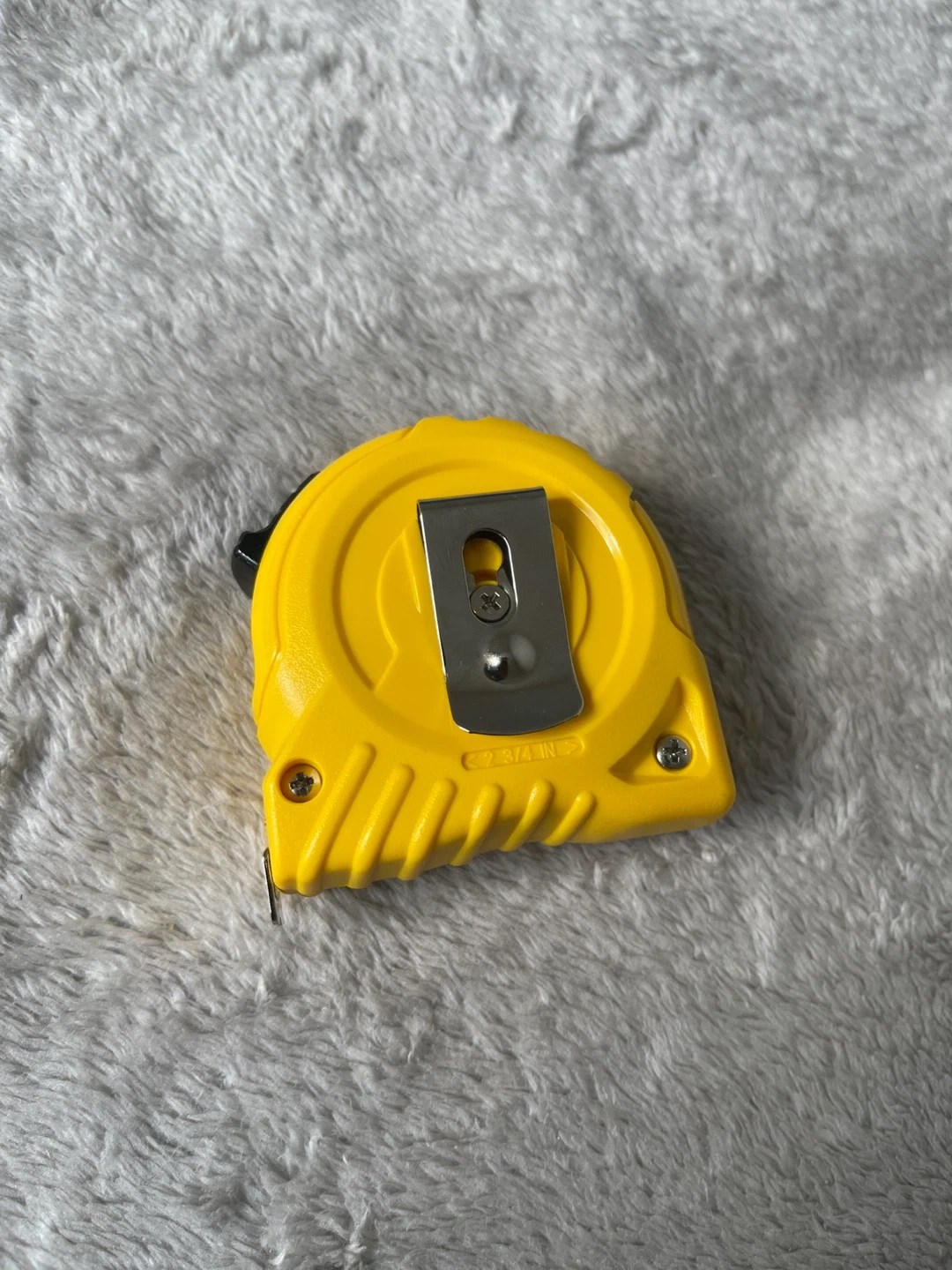 It has a durable yellow casing with a metal belt clip on the back.