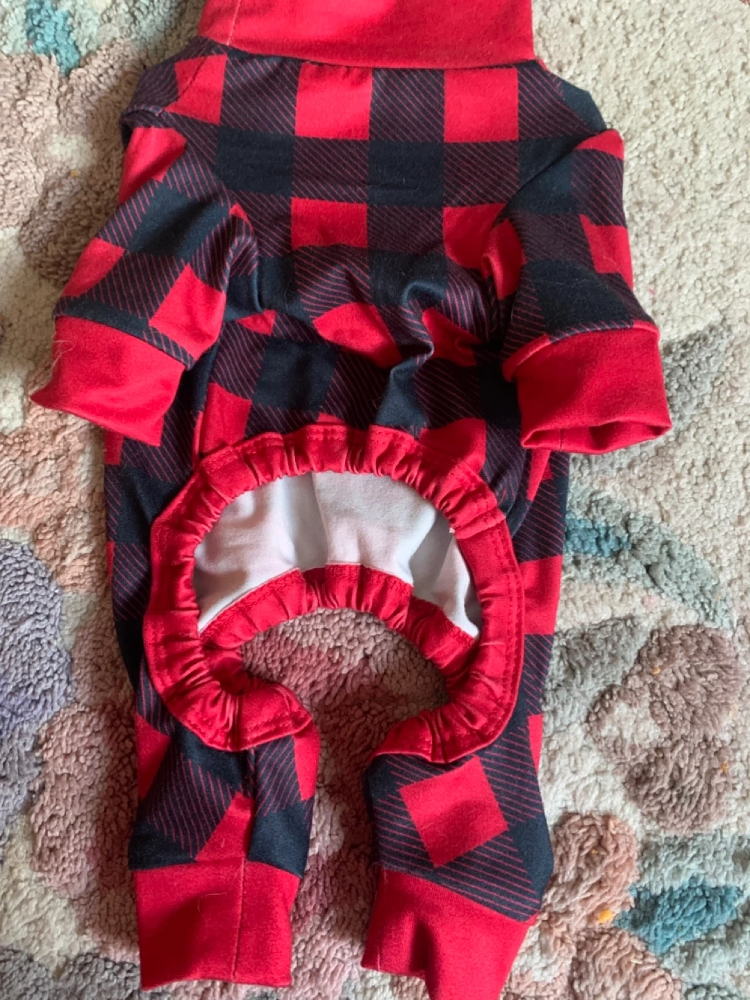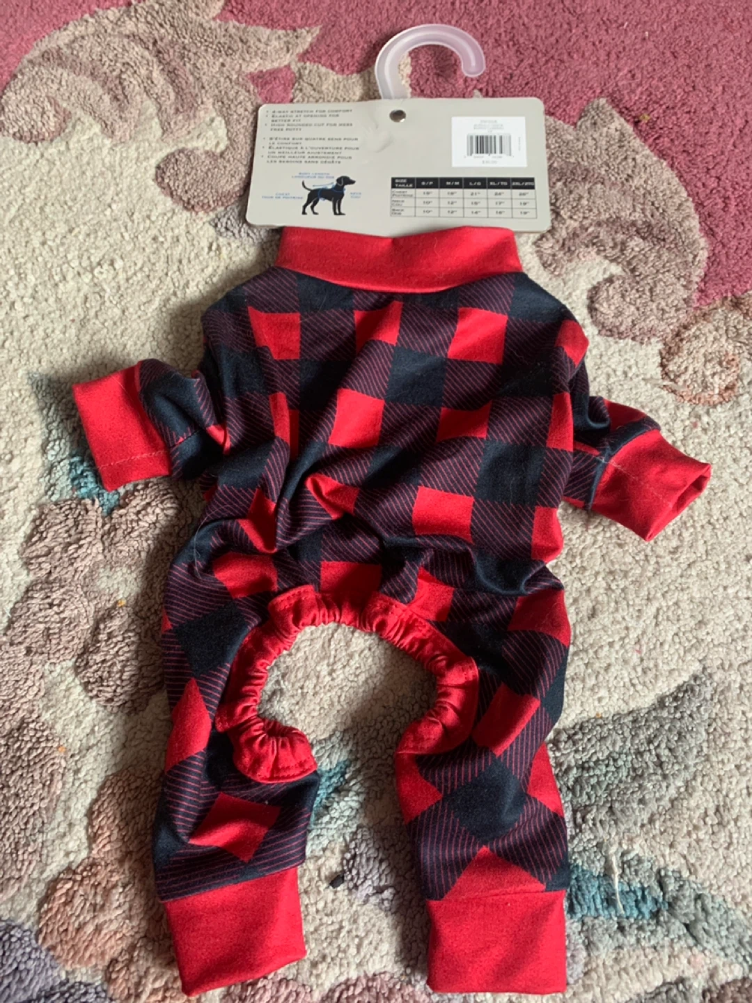 These dog pajamas feature a cozy buffalo check pattern and are made with 4-way stretch fabric for comfort. They have elastic at the opening for a better fit and a high rounded cut for mess-free potty breaks. Perfect for keeping your furry friend warm and snug! Brand new! Size small