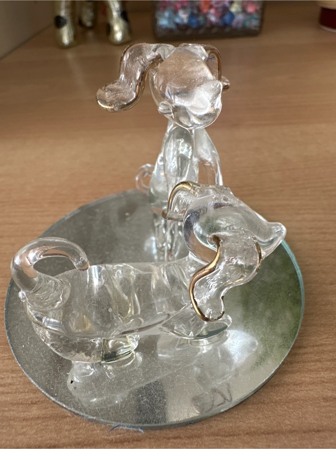 Clear glass figurine featuring a dachshund and another dog, resting on a mirrored circular base. The dogs have delicate gold accents on their ears and tails. It's a cute decorative piece for any shelf or tabletop.