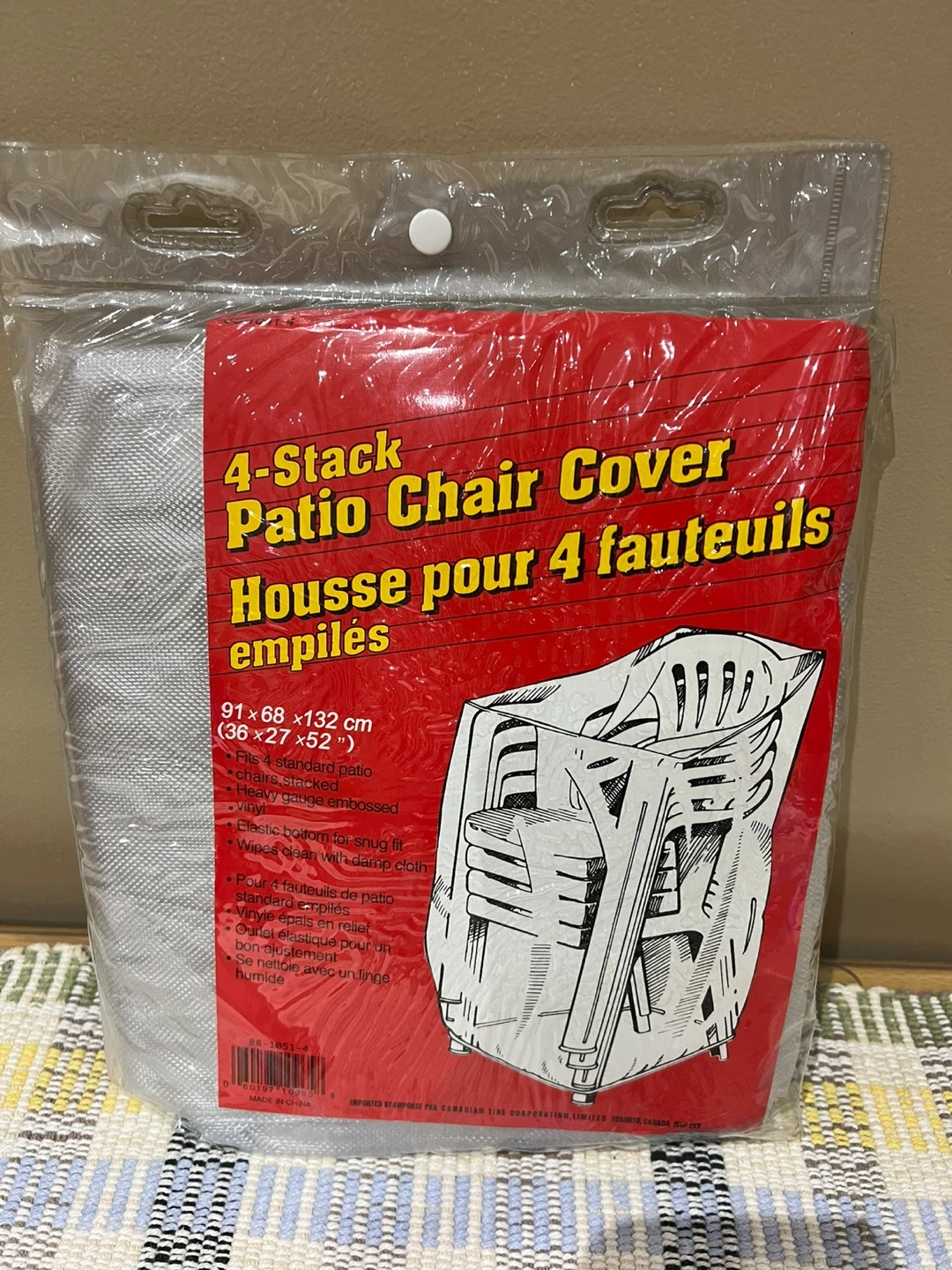 This is a 4-stack patio chair cover. It fits 4 standard patio chairs and is made of heavy gauge embossed vinyl. The elastic bottom offers a snug fit and it wipes clean with a damp cloth.