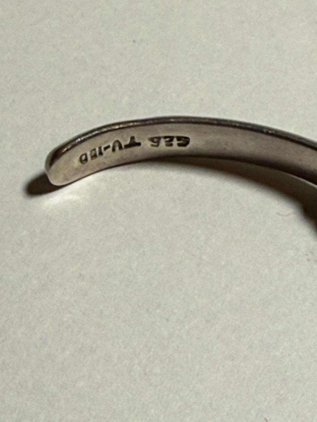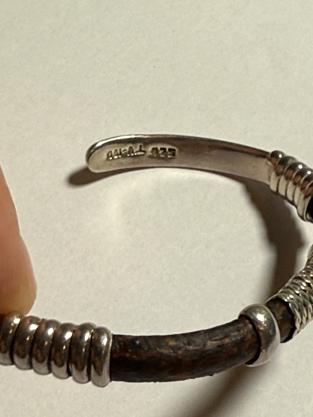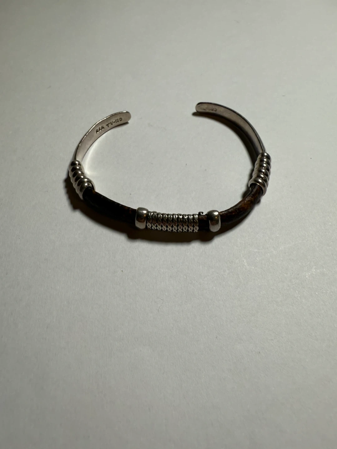 This is a sterling silver cuff bracelet with a dark wood inlay. It features textured silver detailing along the band. The inside is stamped "444 TV-150" and "925".