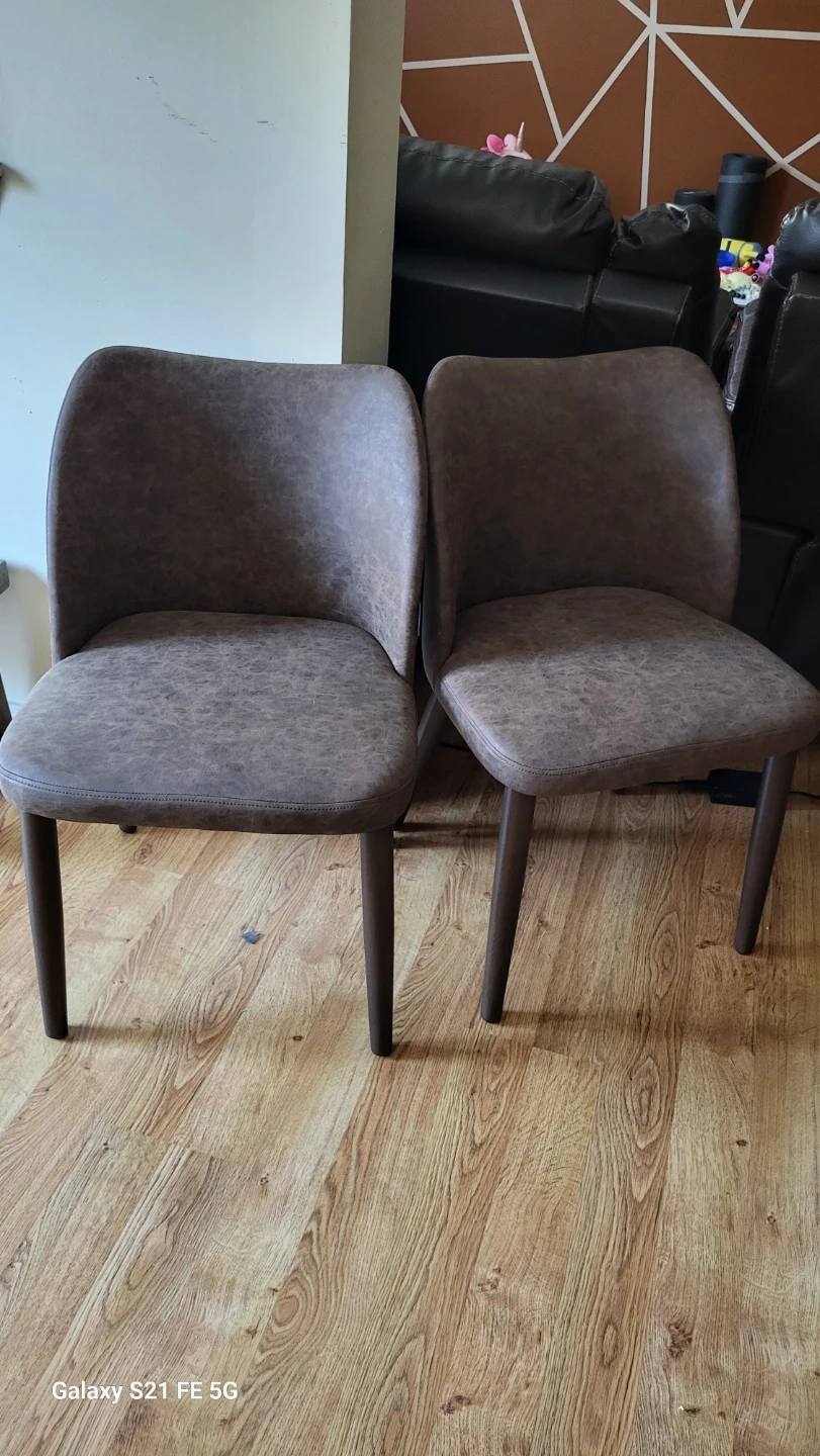 Two dining chairs with a brown faux leather upholstery. They have a stitched detail on the seat and back. The legs are dark wood.