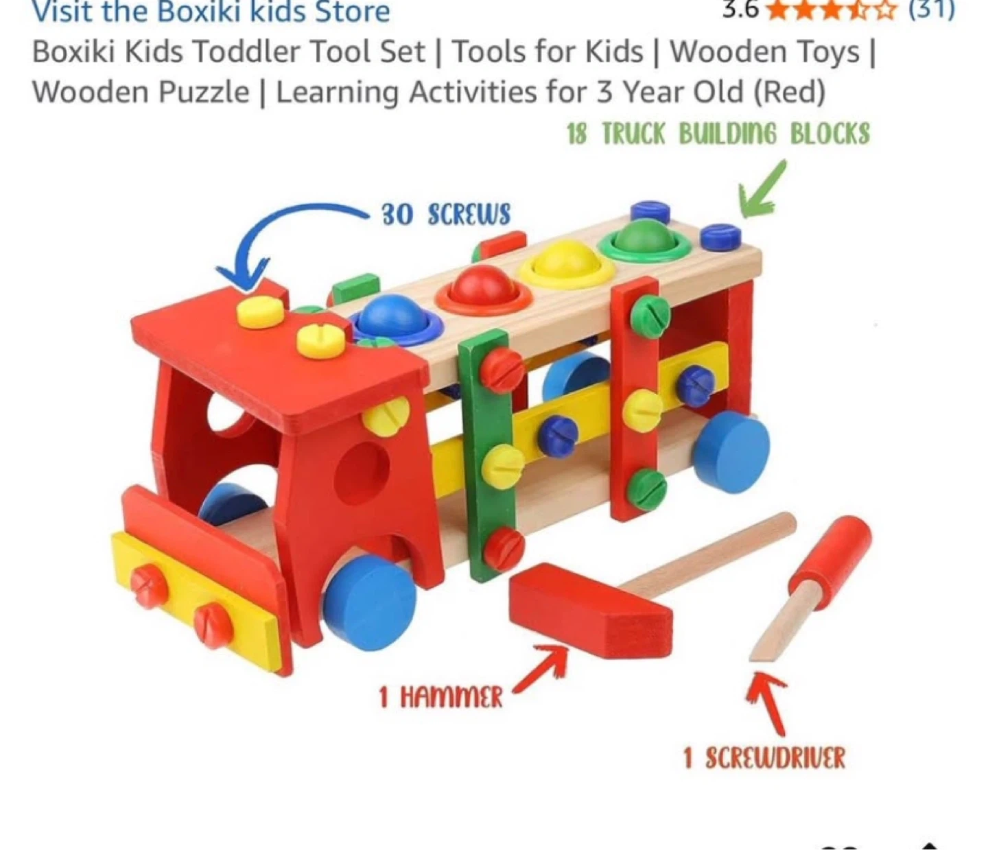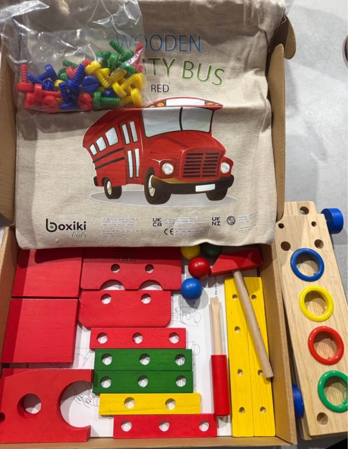 This Boxiki Kids activity bus is a red wooden toy set with 18 truck building blocks and 30 screws. It includes a hammer and a screwdriver for building fun. It's a great way for little ones to develop fine motor skills!