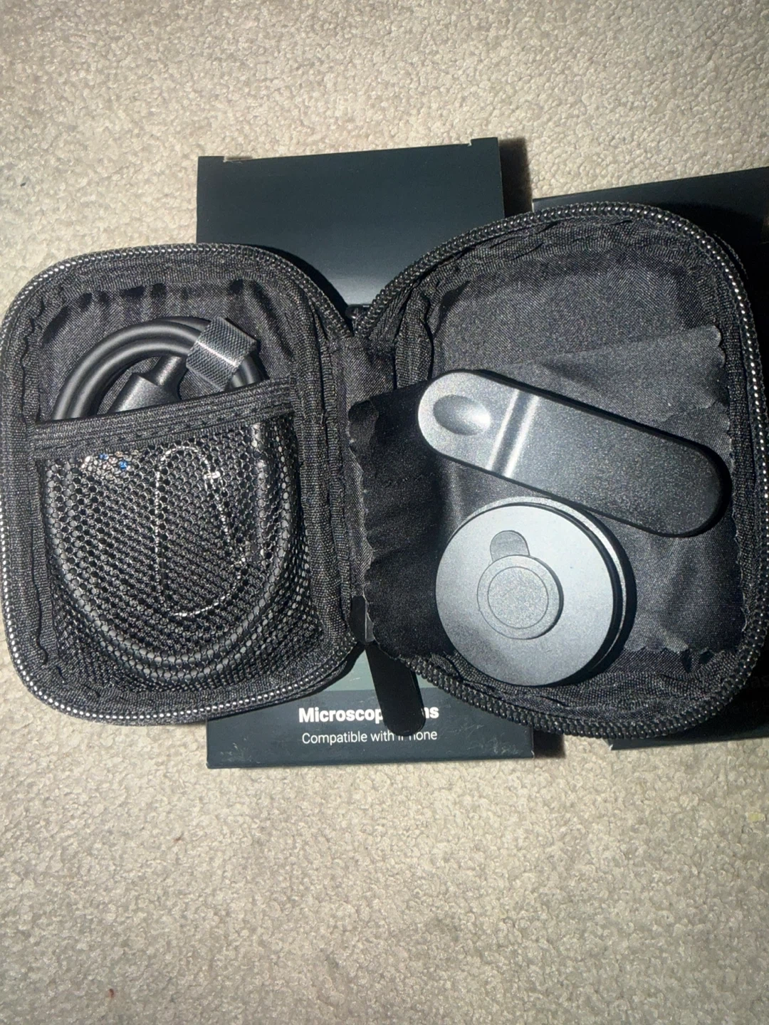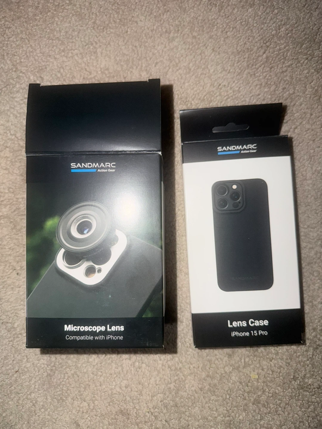SANDMARC Microscope Lens for iPhone with a carrying case. It offers 40x magnification for detailed shots. Includes lens and protective case.