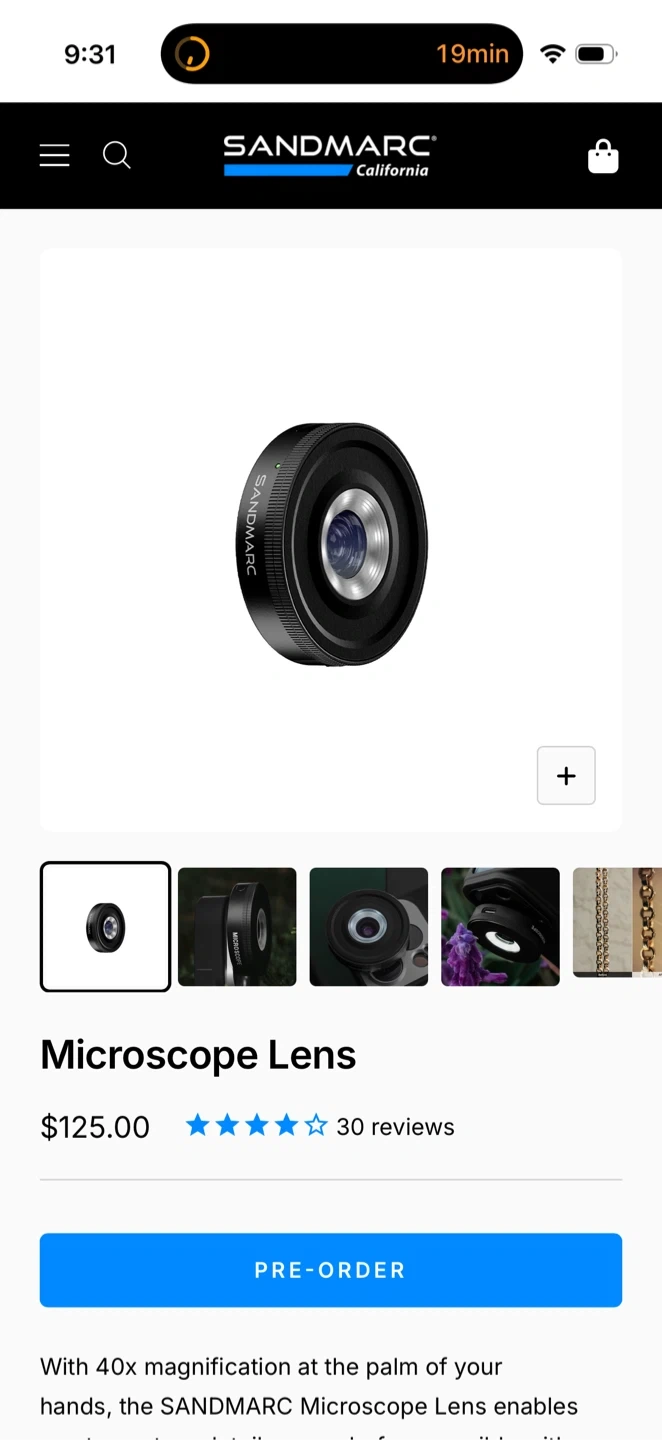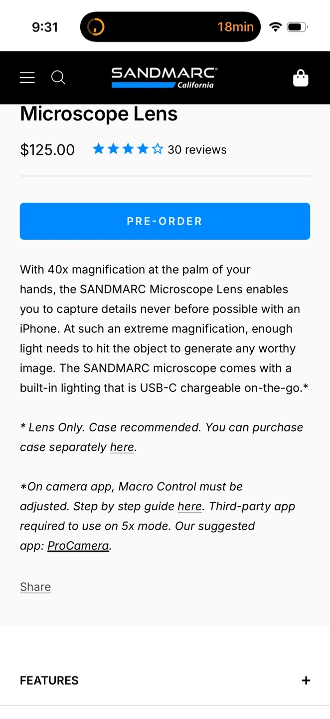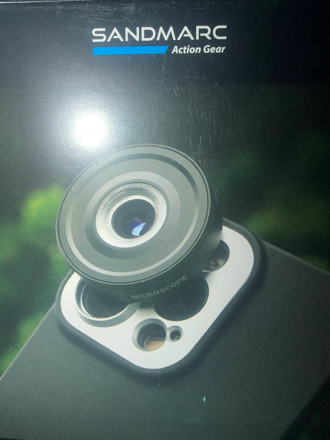 SANDMARC Microscope Lens for iPhone with a carrying case. It offers 40x magnification for detailed shots. Includes lens and protective case.