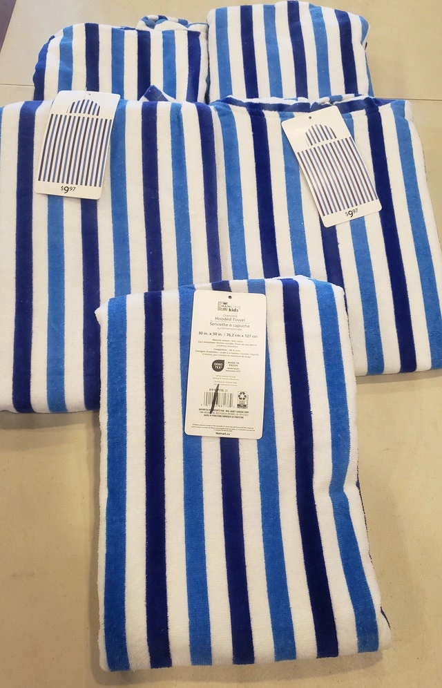 Set of 5 matching kids hooded towels, blue and white stripes. Size 30" x 50". New (some with tags, some without - all unused). Features a hood and matching striped design. Great for siblings, cottage, pool, camping or daycare - easy to spot your kids with matching towels. Take the full set of 5 for $25. Pickup in Bradford (Tim Hortons, 440 Holland St W - beside Canadian Tire). Cash or e-transfer on pickup.