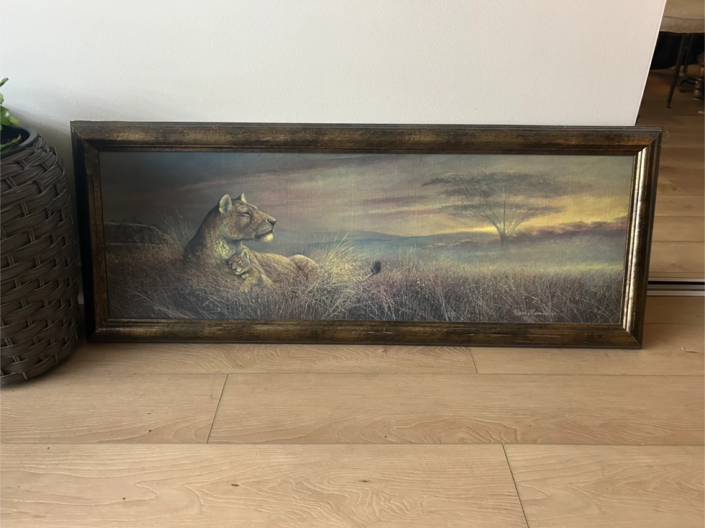 Selling a framed print of a lioness and her cub resting in tall grass at sunset. The frame is a dark, distressed wood