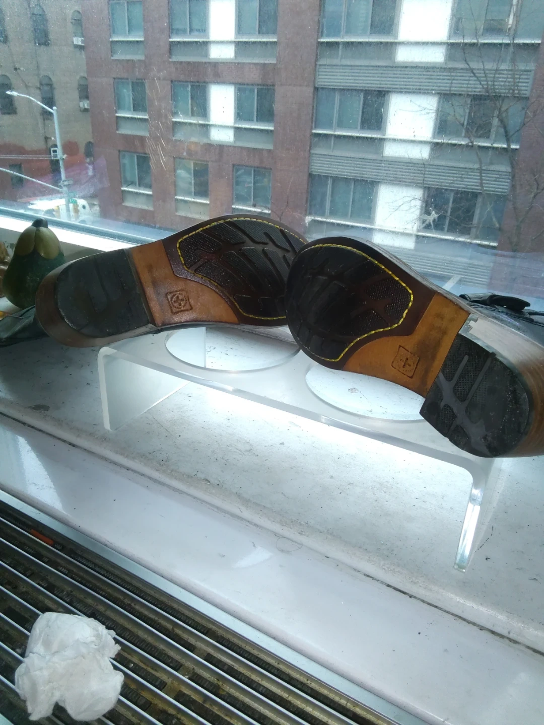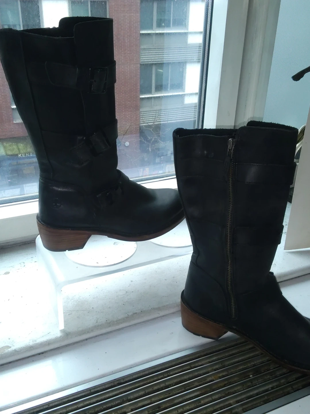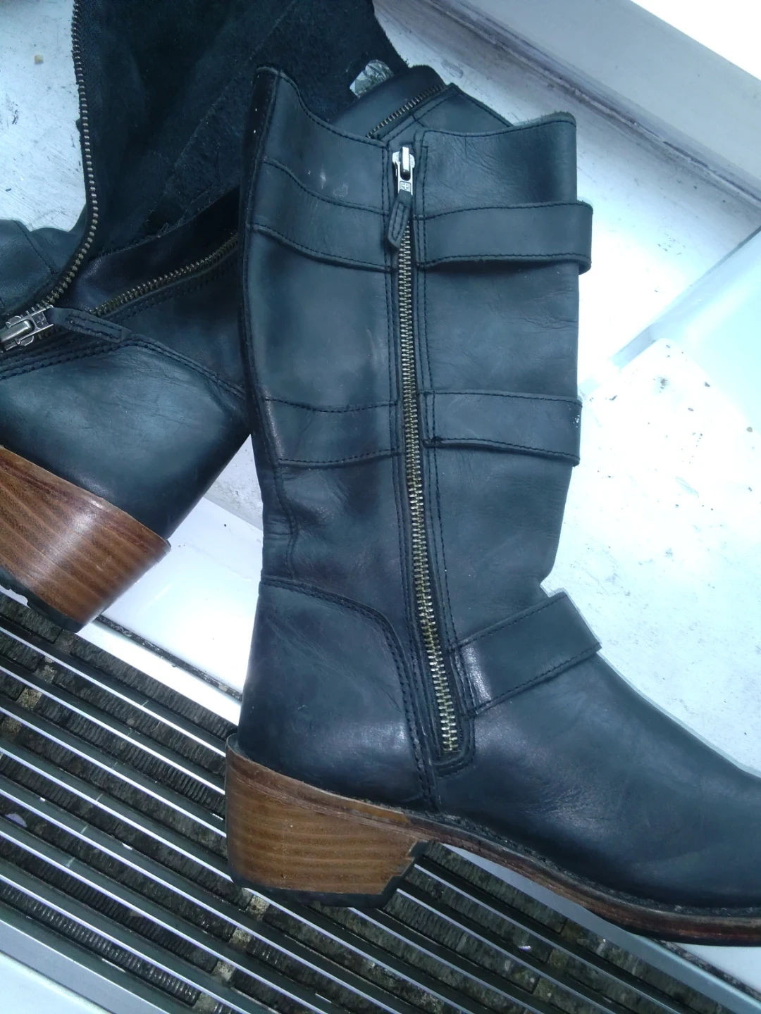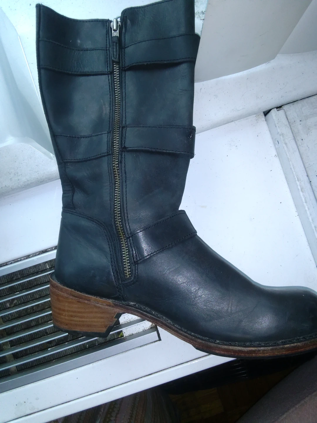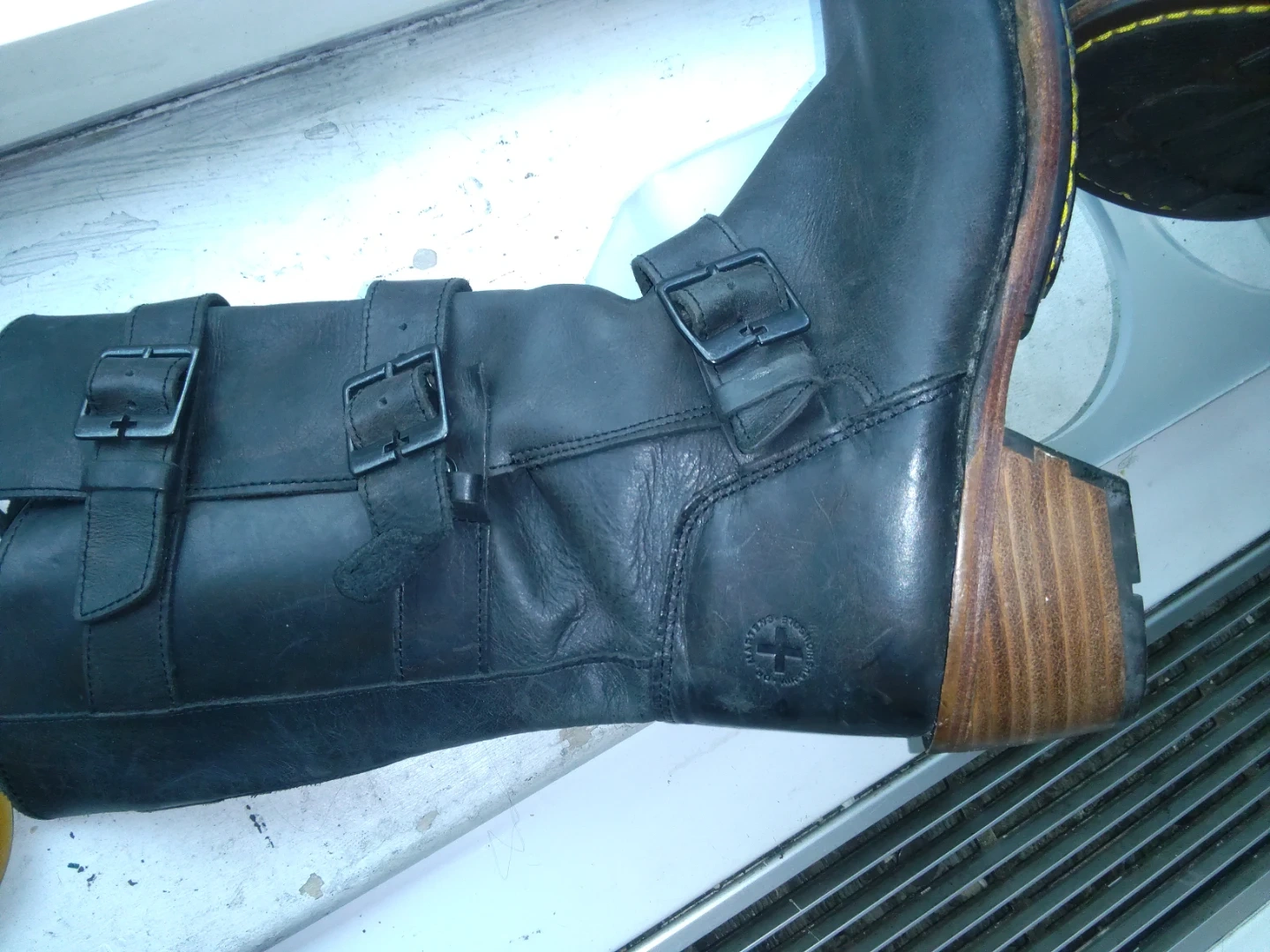 These are stylish black leather motorcycle boots from Dr. Martens. They feature a side zipper and adjustable buckle straps for a secure fit. The wooden heel adds a classic touch to the design. Perfect for adding an edge to any outfit!