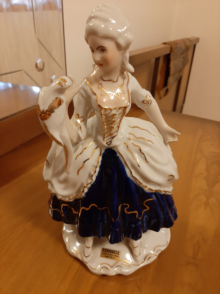 Beautiful KERAMOS figurine. It's china hand made with gold 24 ct accents. The figurine features a woman in a white dress with blue and gold details. It will add a touch of elegance to any room!