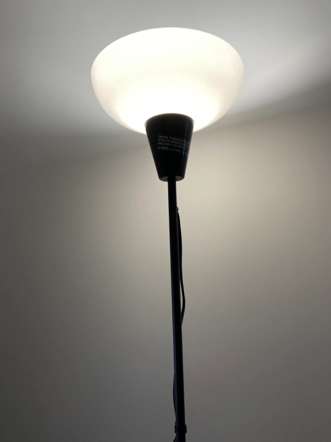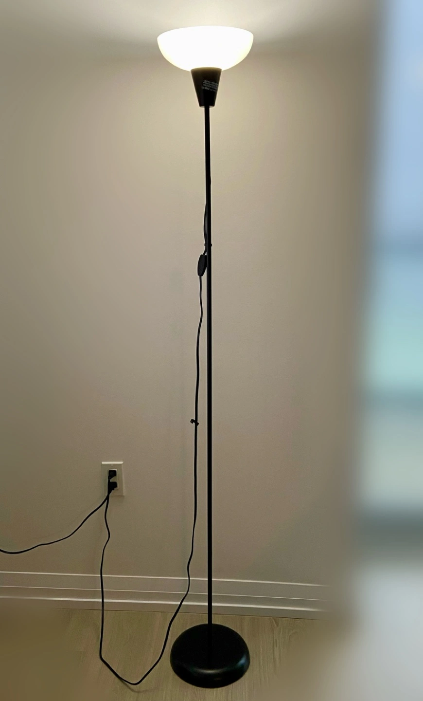 Simple black floor lamp. Features a white, rounded shade. In-line on/off switch located on cord. Good condition. Light bulb is not included.
