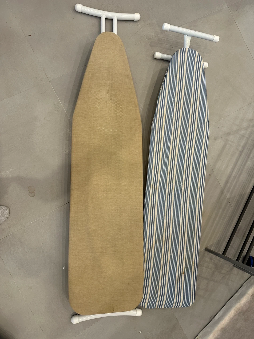 This listing includes two ironing boards, one with a tan cover and another with a blue and white striped cover. Both have metal frames and are for home use.