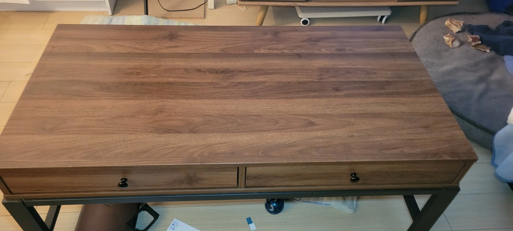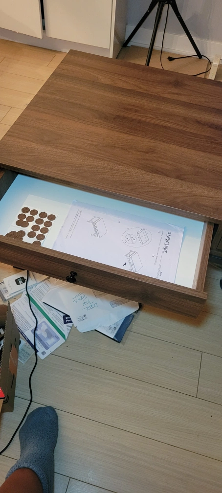 Selling a lovely walnut coffee table! It has a sleek design with handy drawers for storage. The legs are a sturdy black metal. Great for any living room!Excellent condition 2 drawer coffee table. 3 years old. Not listed on Structube anymore. Decided to get something a bit smaller for my space. Kept instruction manual in the drawer as well as the screw cover stickers if you feel compelled to hide the screws. No scratches no stains. Metal frame. Pretty solid. If you live close by it's easy to walk over with two people.