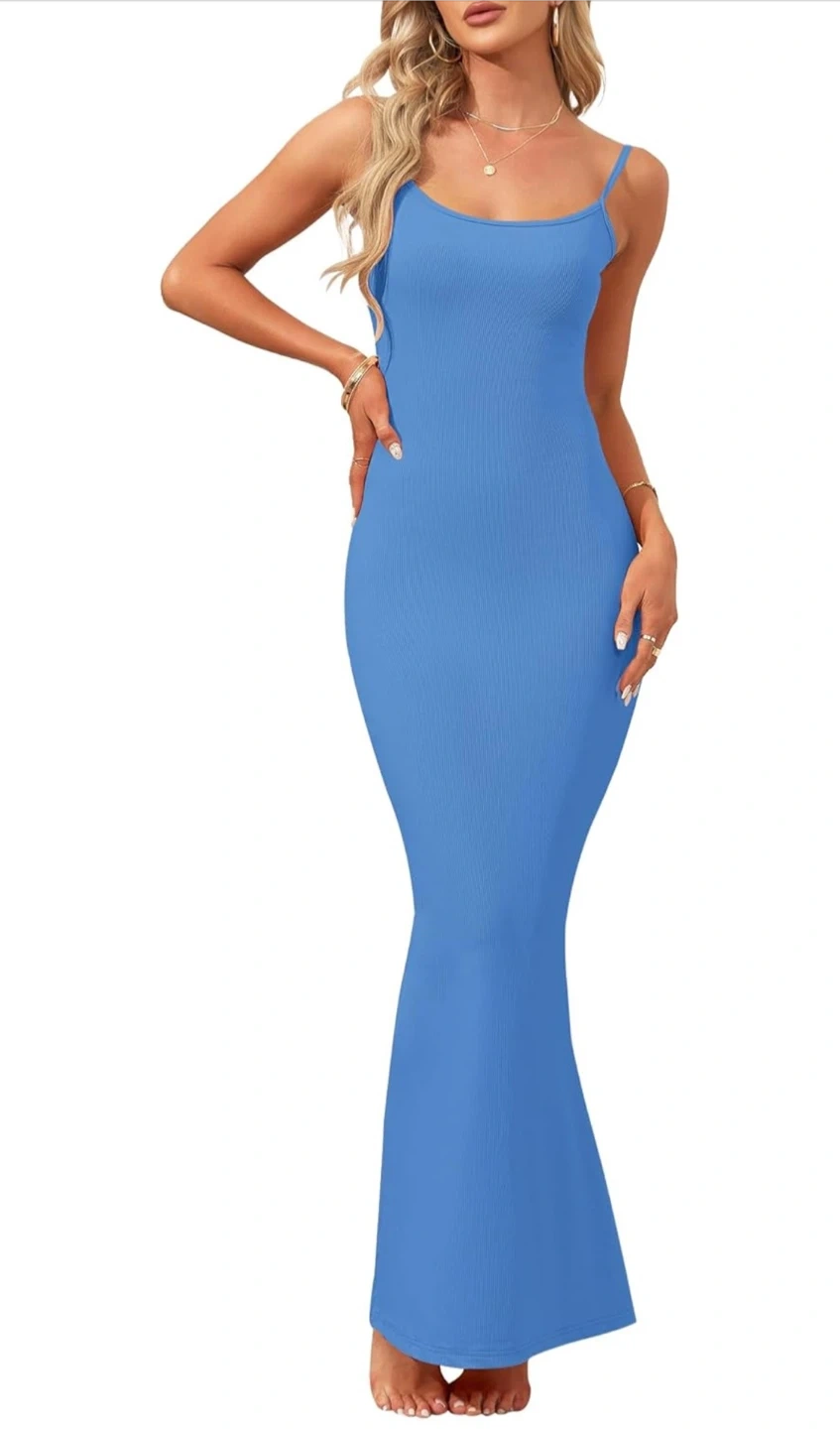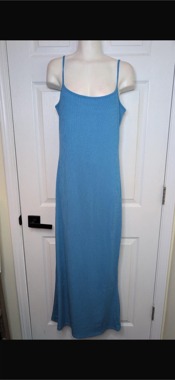NEW! WNEEDU Blue Sexy Ribbed Spaghetti Strap Bodycon Maxi Dress