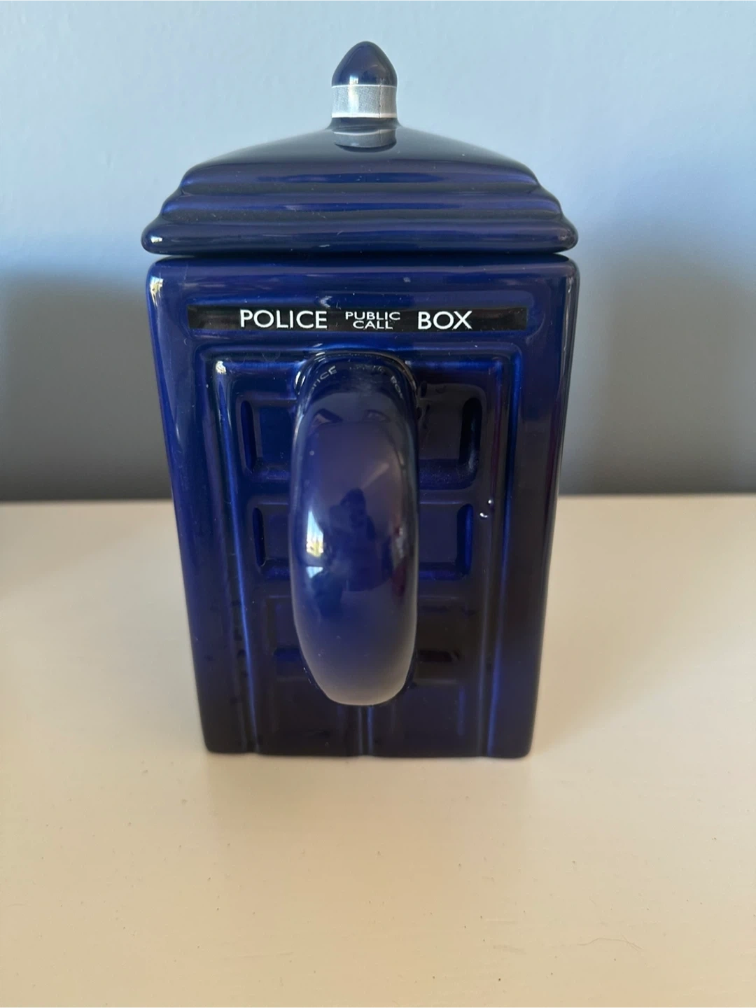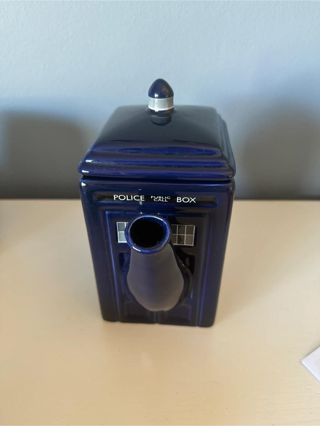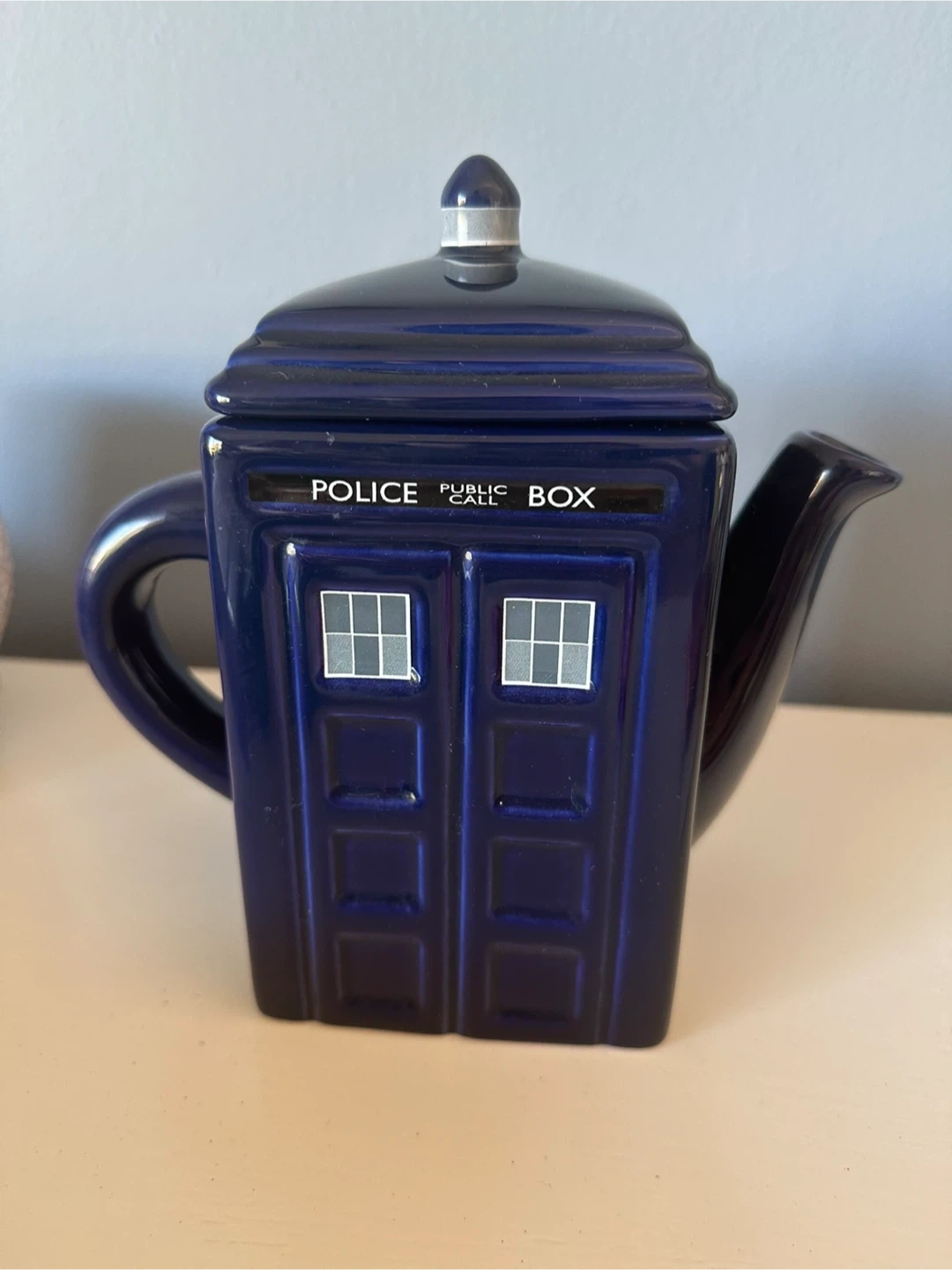 Selling a fun Doctor Who TARDIS teapot! It's in great shape except for small chip under the lid which isn’t noticeable when on. It measures just under 8”. Perfect for any Doctor Who fan who loves tea!