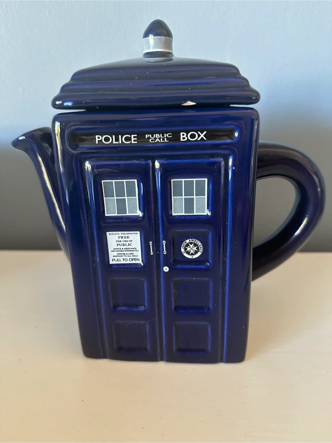 Selling a fun Doctor Who TARDIS teapot! It's in great shape except for small chip under the lid which isn’t noticeable when on. It measures just under 8”. Perfect for any Doctor Who fan who loves tea!