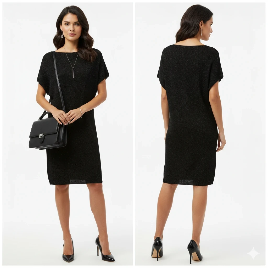 The fabric is a high-quality, midweight viscose blend infused with metallic threading, giving it a subtle "starry night" sparkle that catches the light beautifully. Its exceptional stretch ensures maximum comfort while maintaining a sleek, avant-garde silhouette.