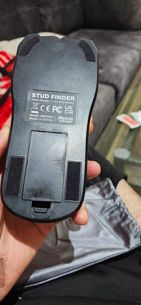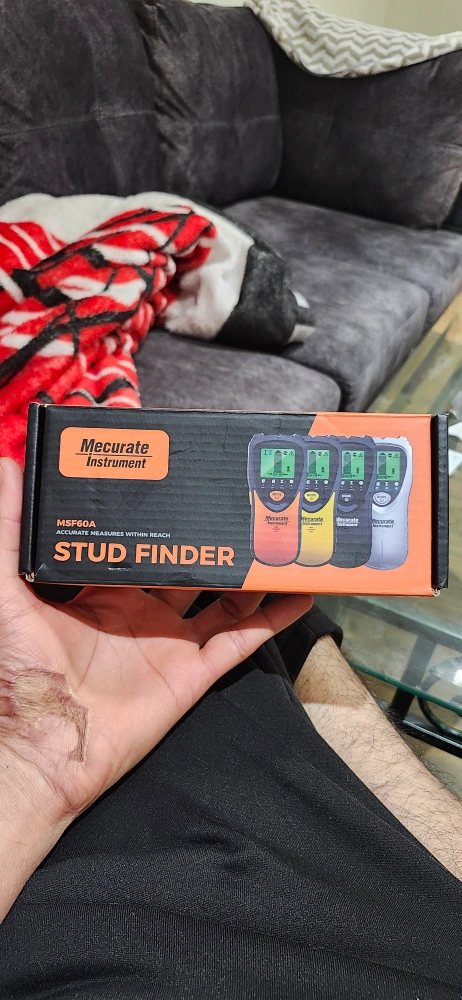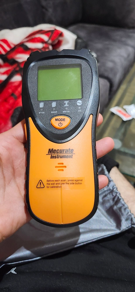 Stud finder with multiple modes: stud, deep, metal, AC. Includes a carrying bag and 9V battery.