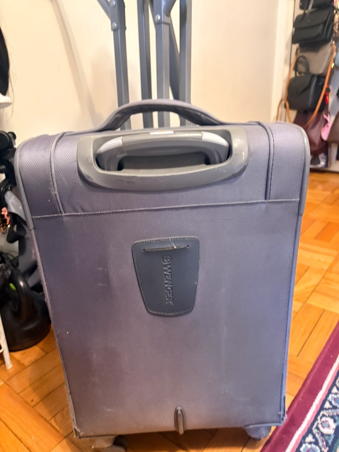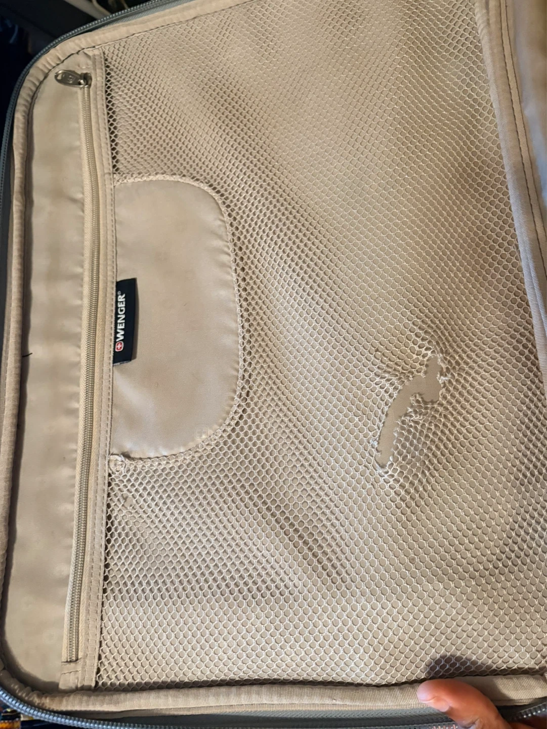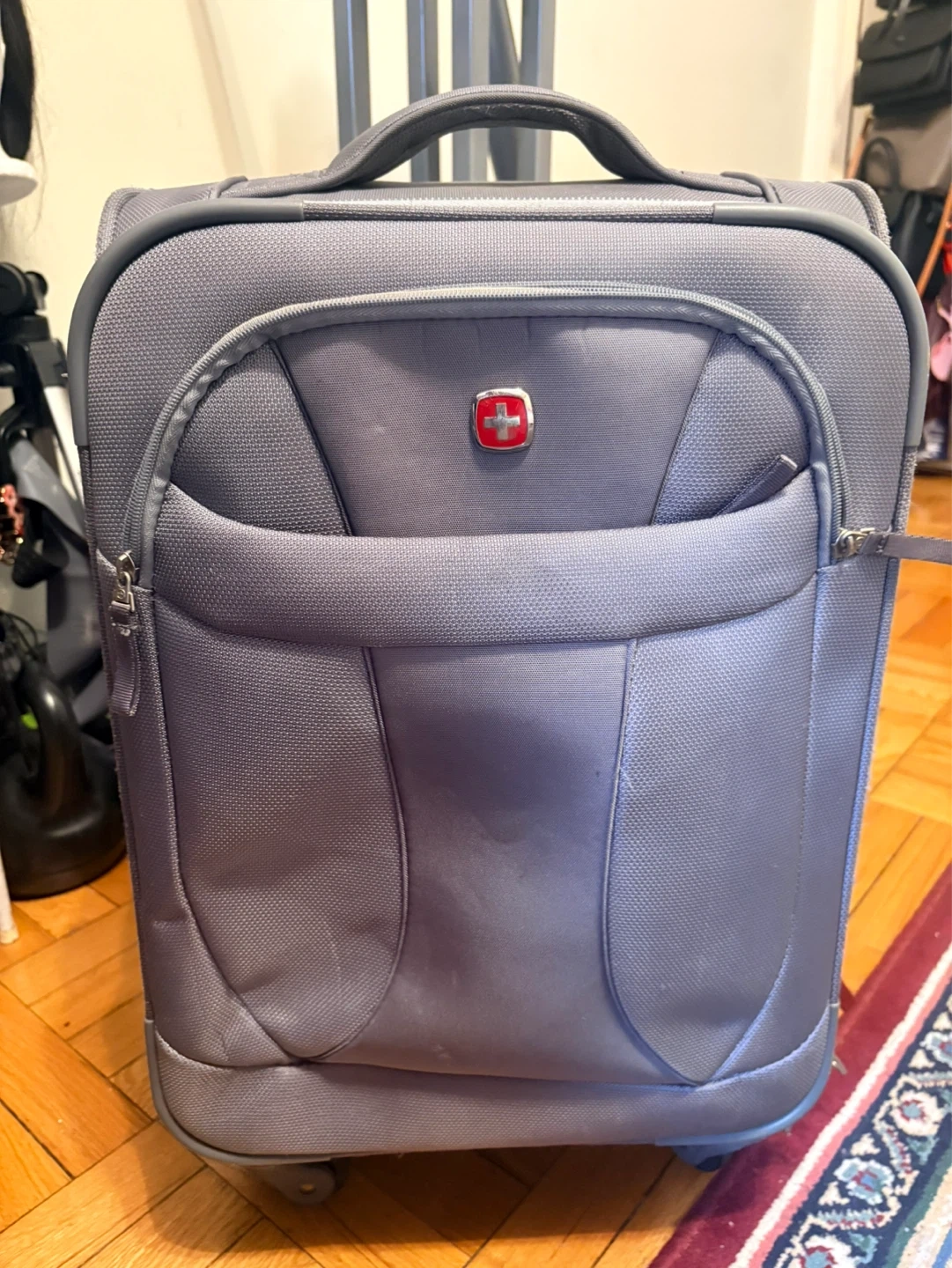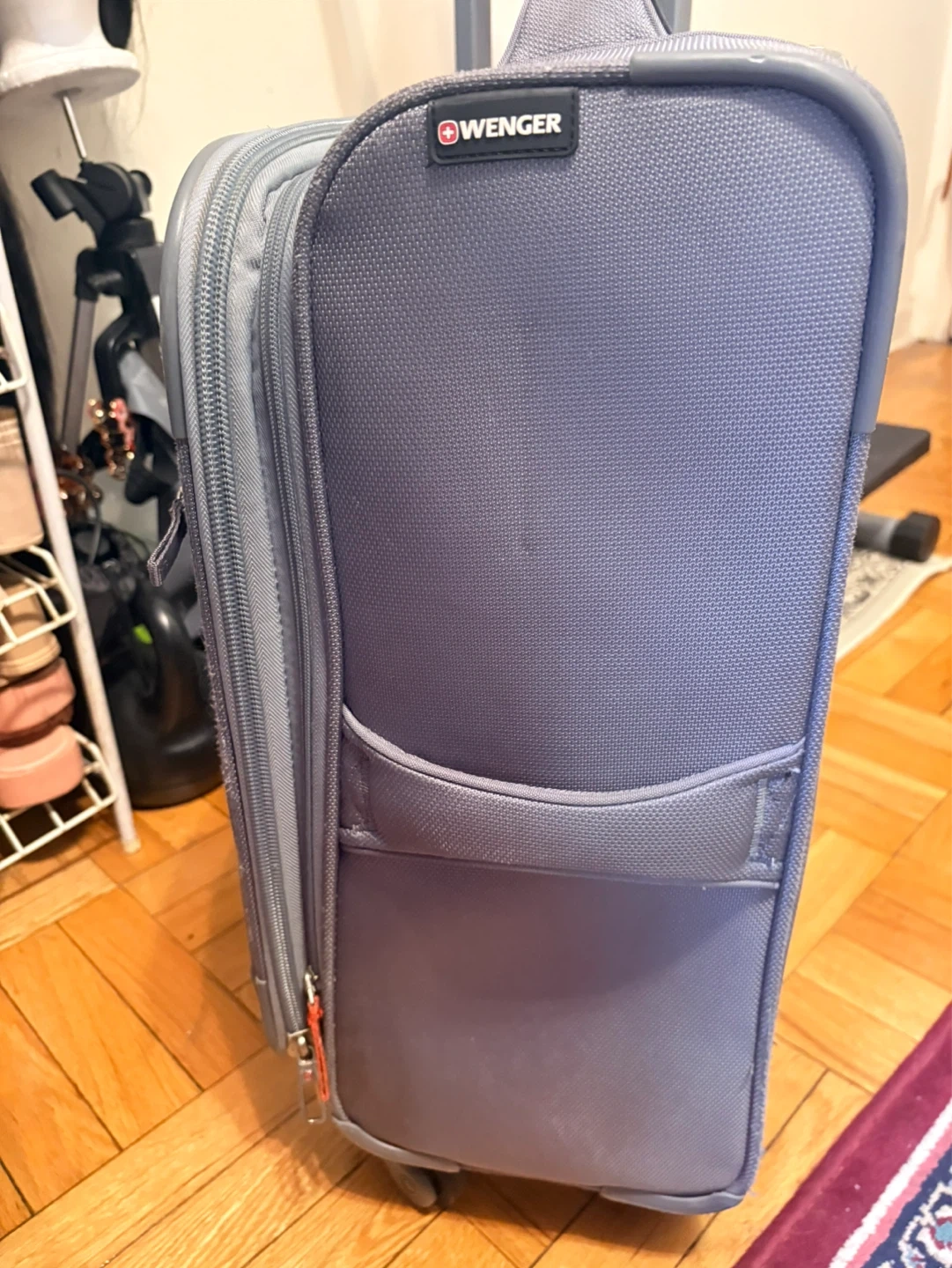 Wenger grey carry-on suitcase with wheels and retractable handle. Has multiple zippered compartments for organization. Measures approximately 22 inches in height. Inner pocket has a small tip as seen in the last picture.