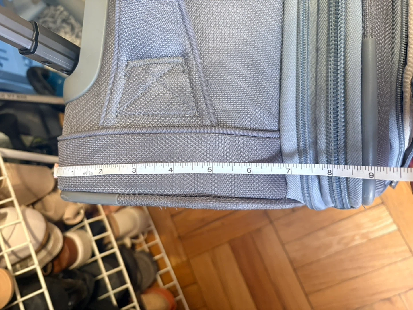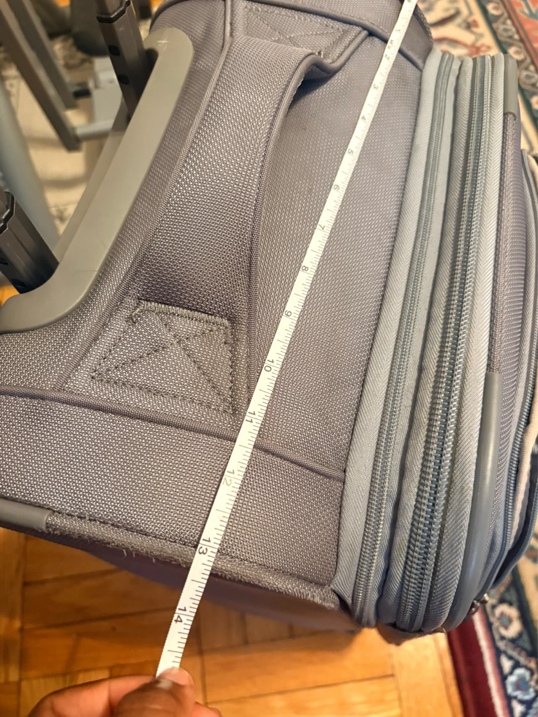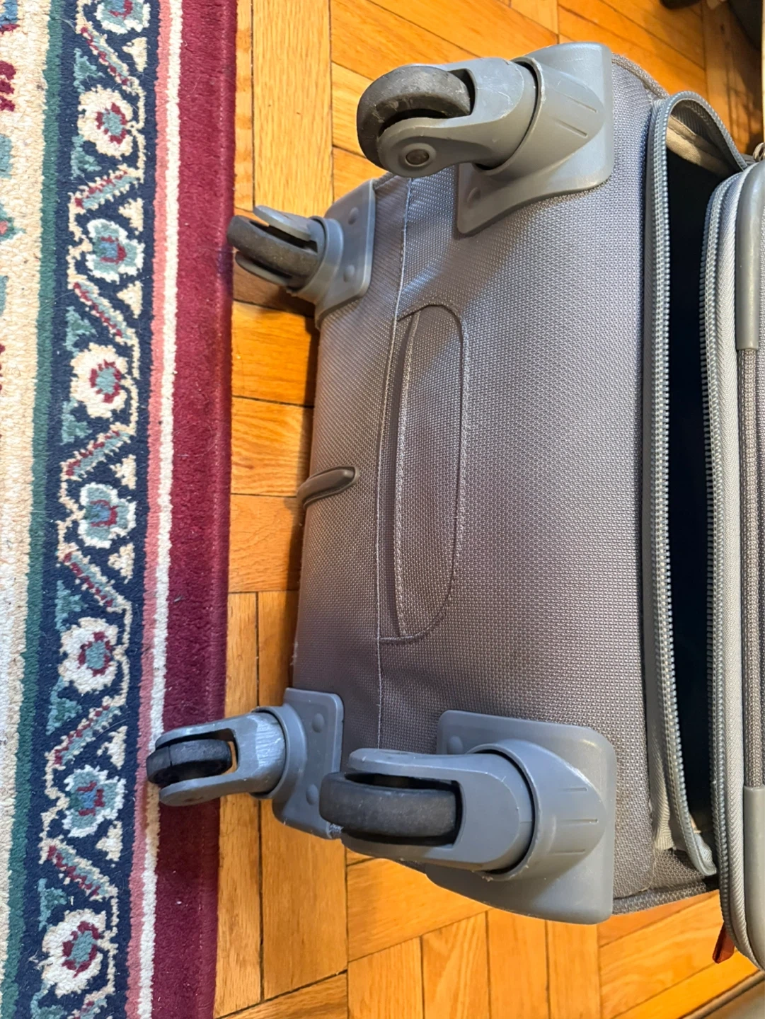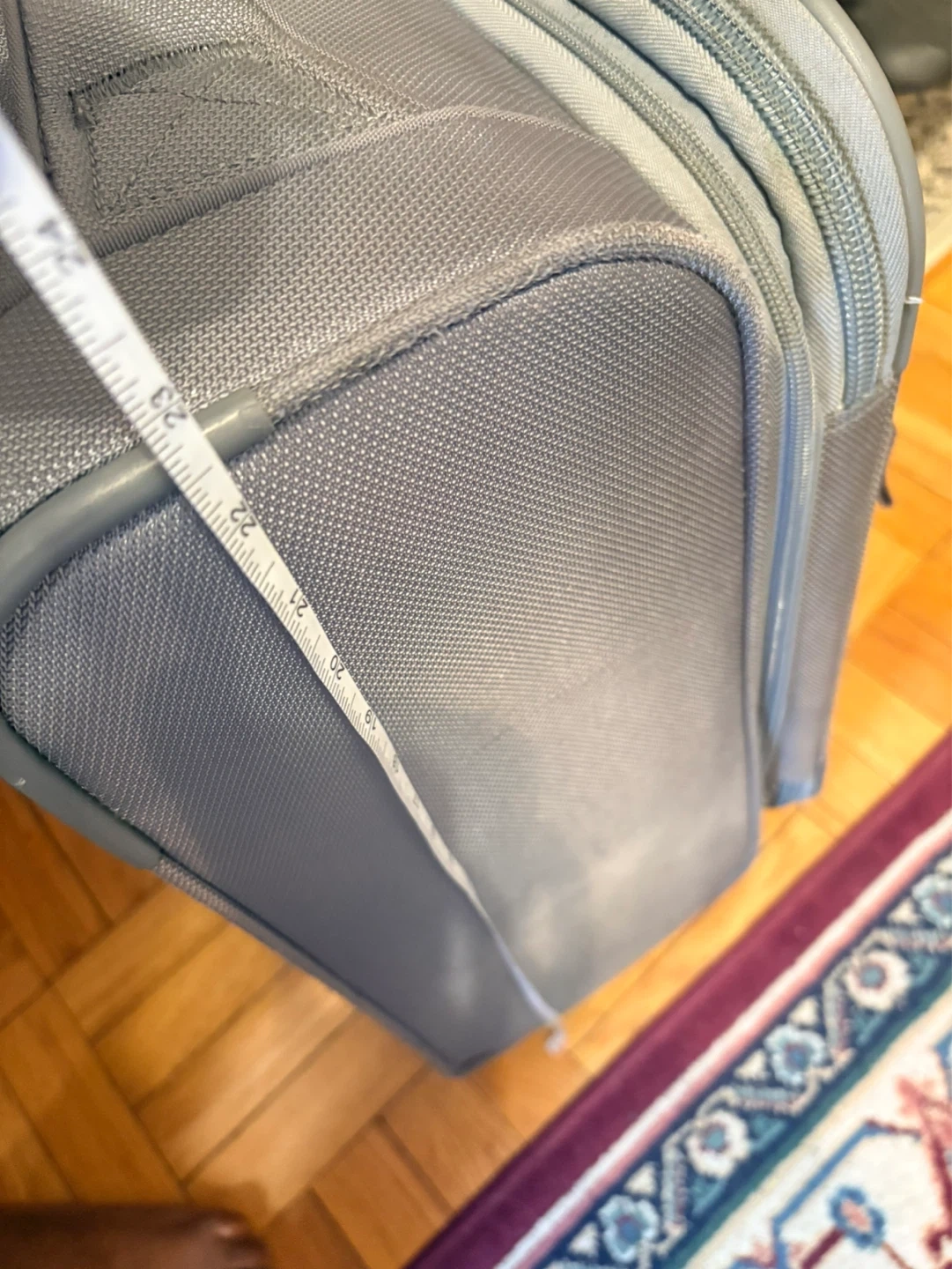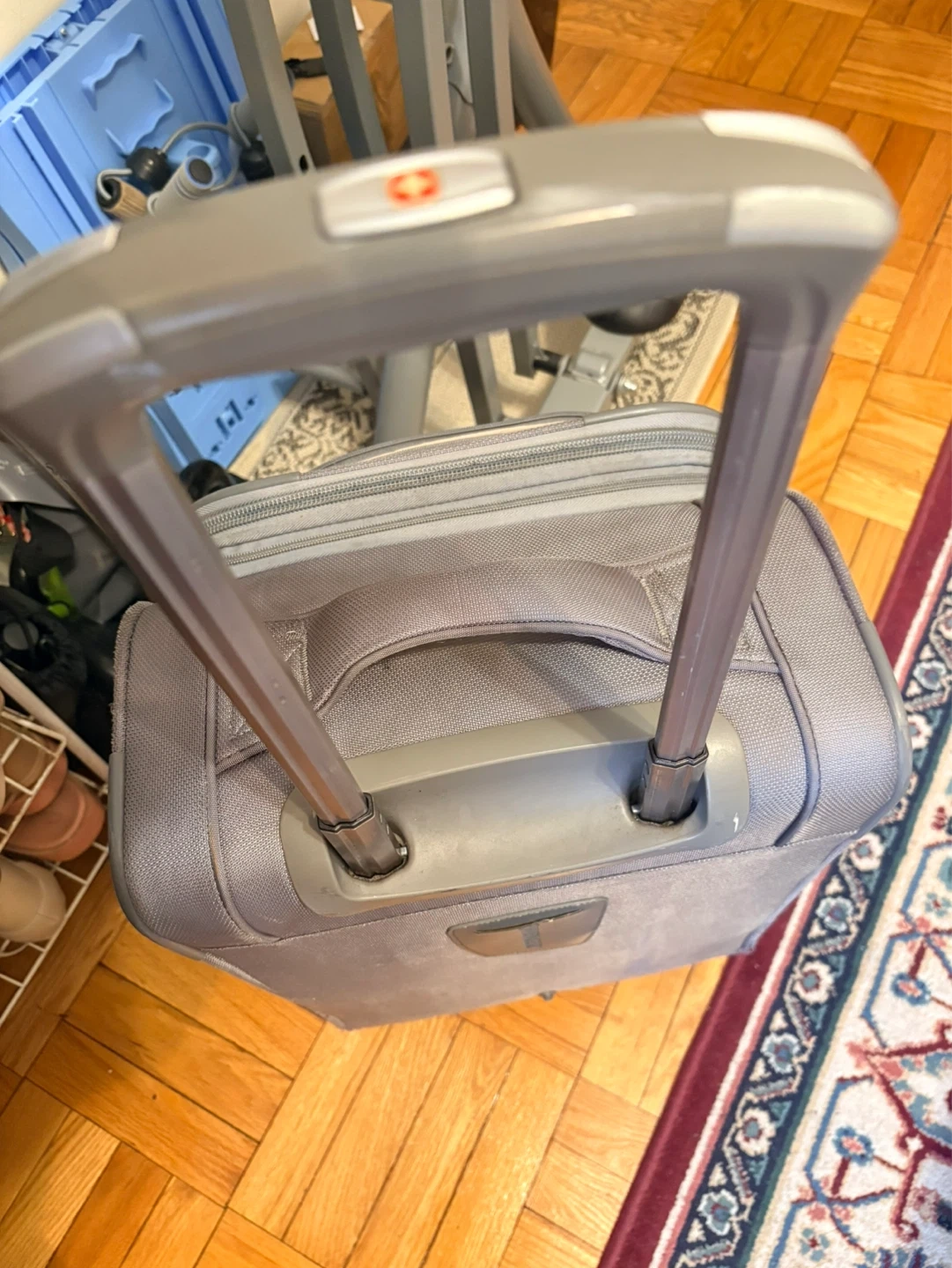 Wenger grey carry-on suitcase with wheels and retractable handle. Has multiple zippered compartments for organization. Measures approximately 22 inches in height. Inner pocket has a small tip as seen in the last picture.