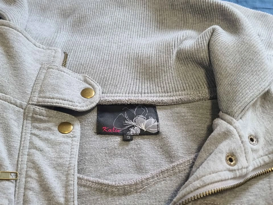 Stylish light grey long coat in good condition. Soft and comfortable fabric with ribbed cuffs and hem. Features front zipper with snap buttons, multiple pockets, and adjustable sleeve straps. Warm and perfect for fall/spring.