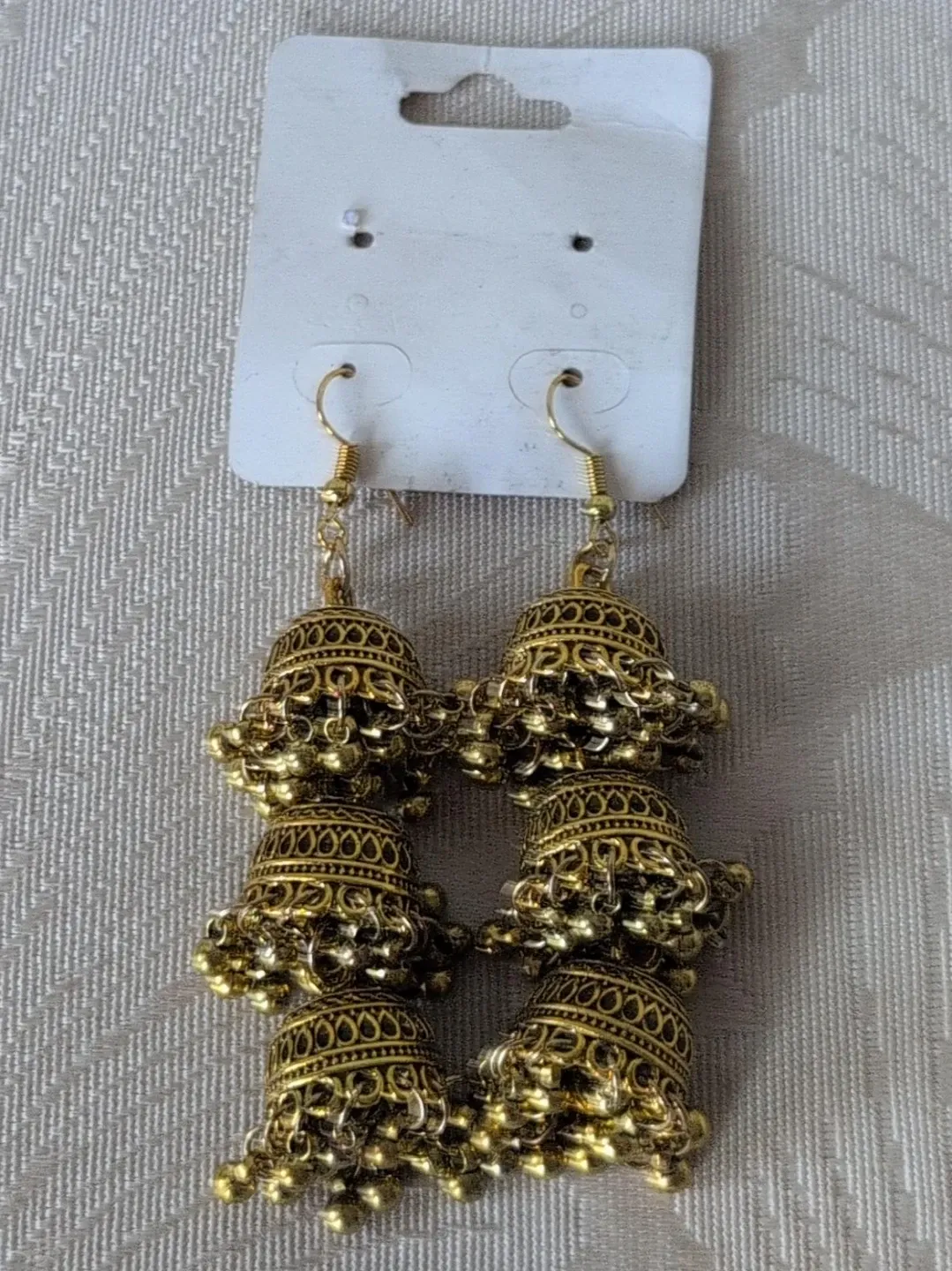 These gold-toned jhumka earrings feature intricate detailing and a bell shape with small dangling beads. They're classic Indian-style earrings. These are perfect for adding a touch of elegance to any traditional outfit!