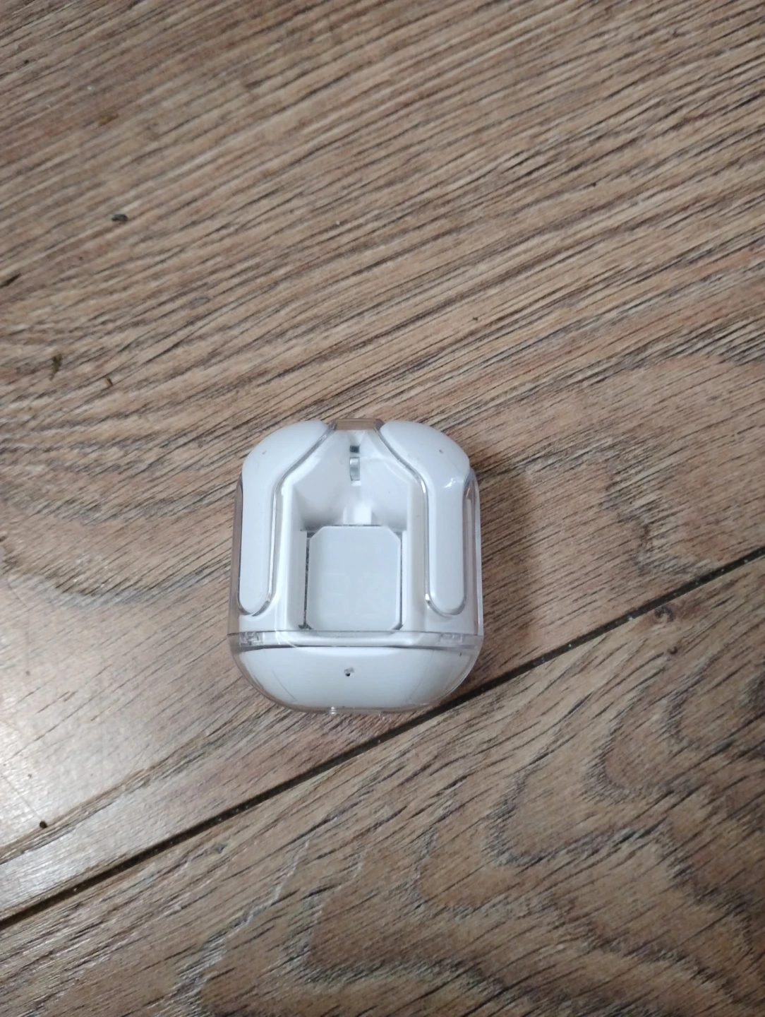 This is a white charging case for wireless earbuds. It has a compact design, perfect for on-the-go charging. The case is made of plastic and includes a USB-C charging port.