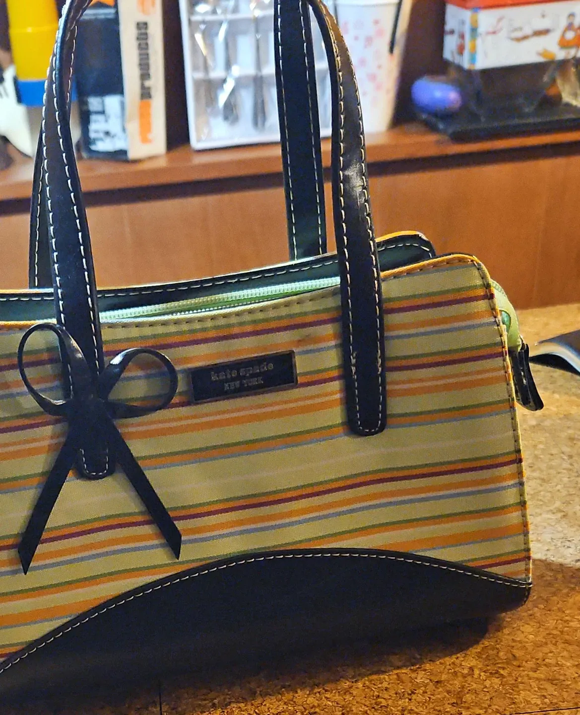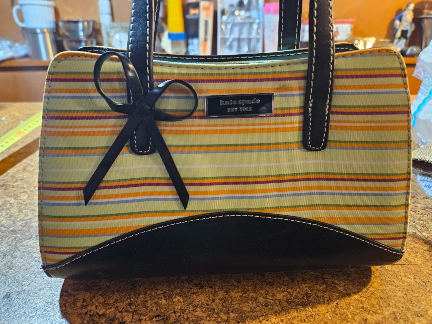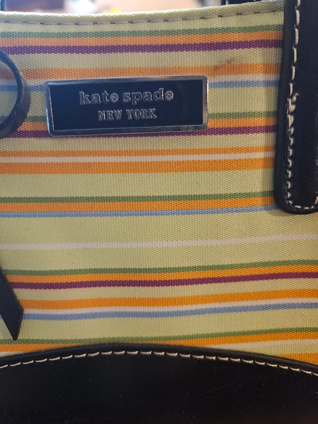 A colourful striped tote bag from Kate Spade New York. It features black leather trim and handles with white contrast stitching. This bag has a zippered closure.
