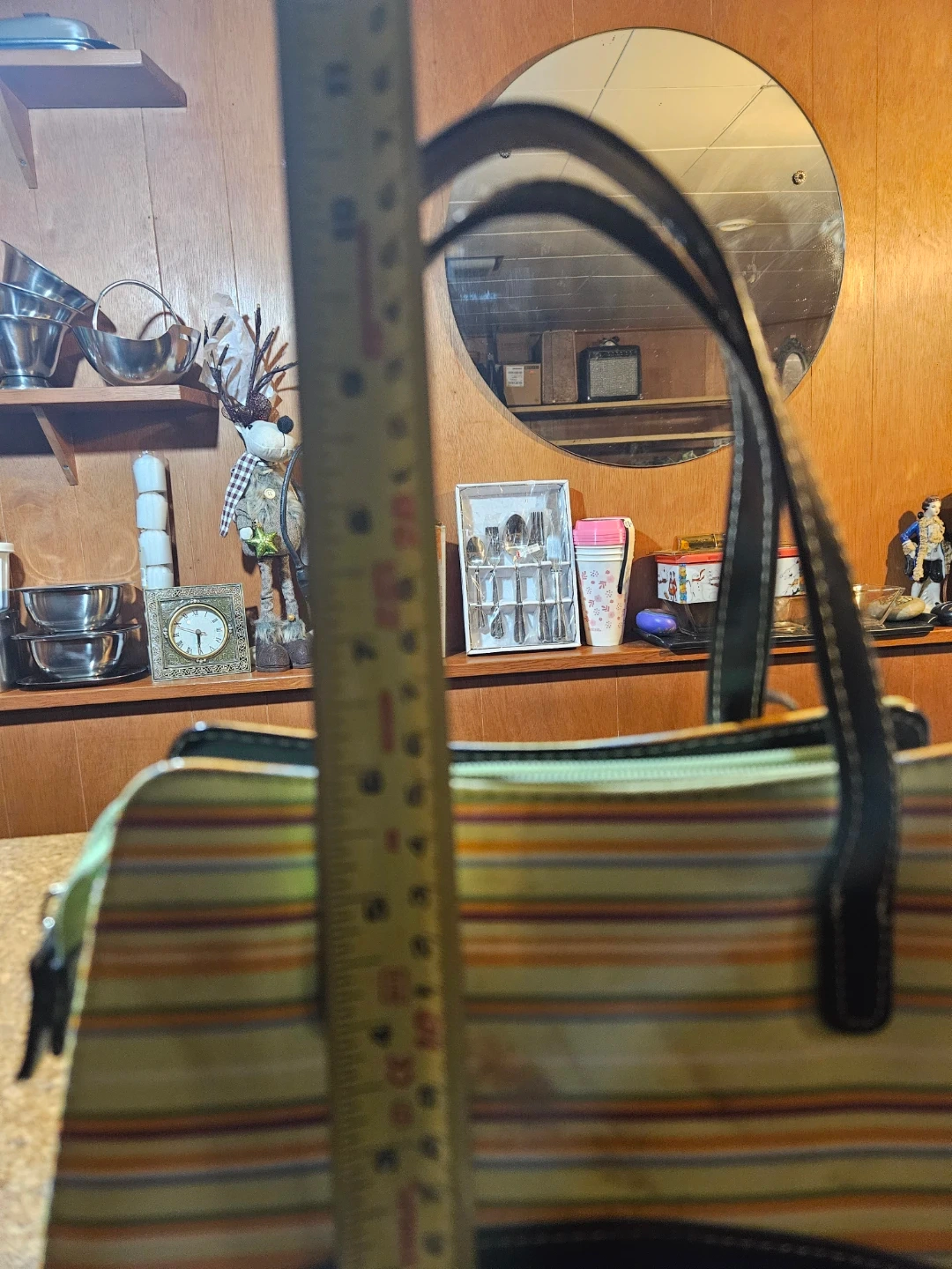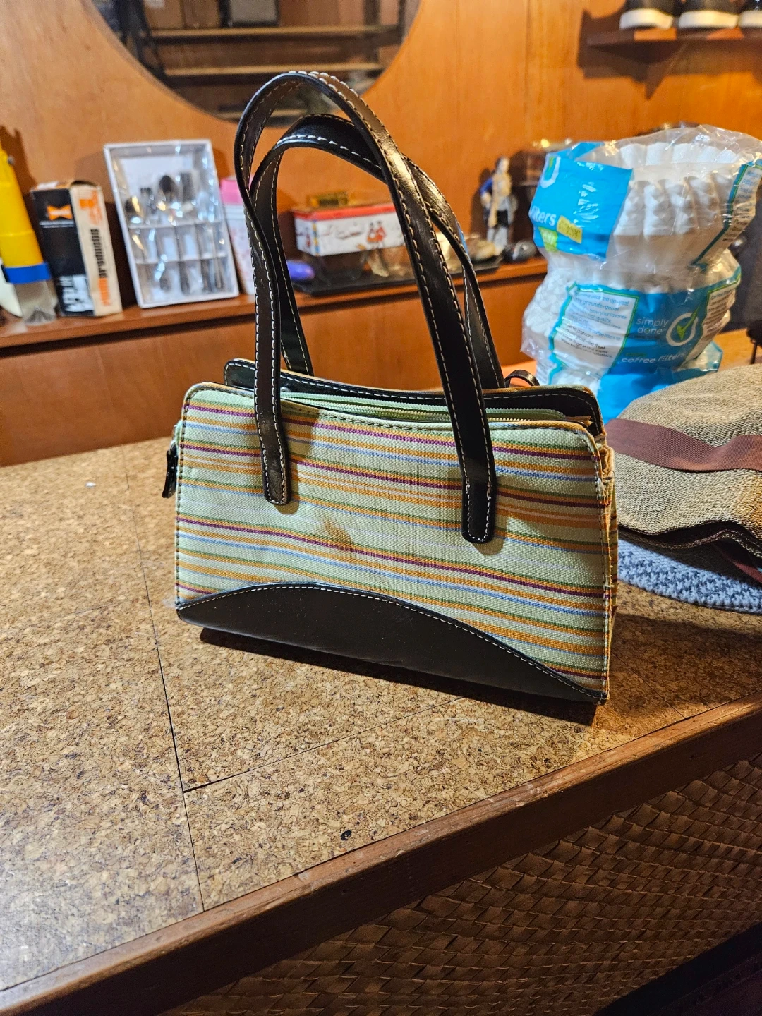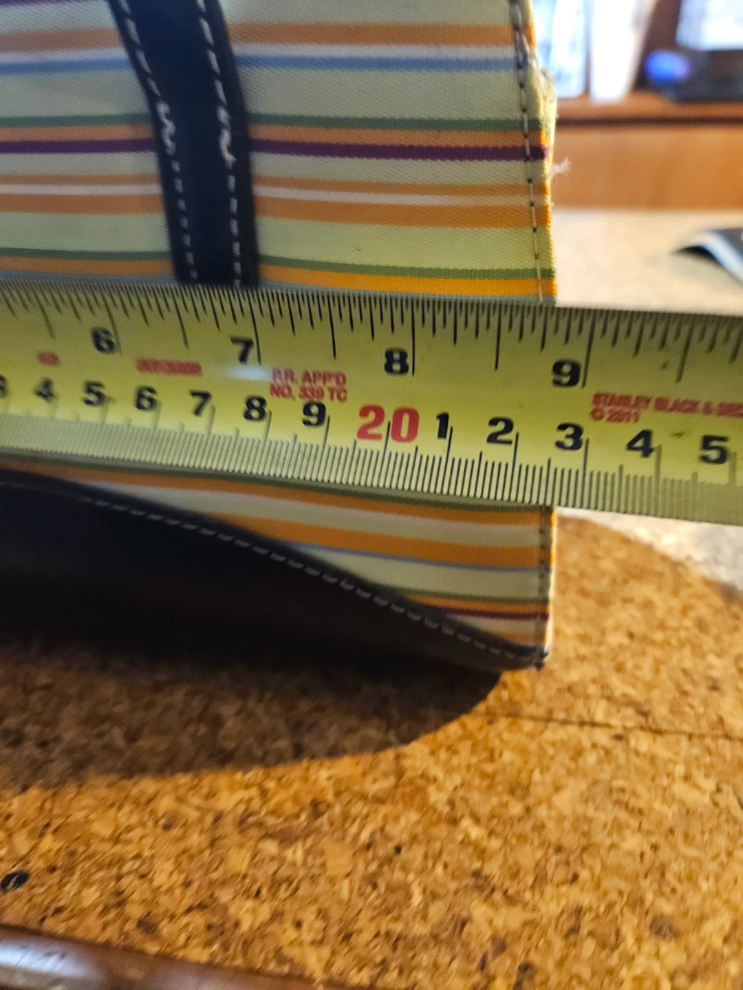A colourful striped tote bag from Kate Spade New York. It features black leather trim and handles with white contrast stitching. This bag has a zippered closure.