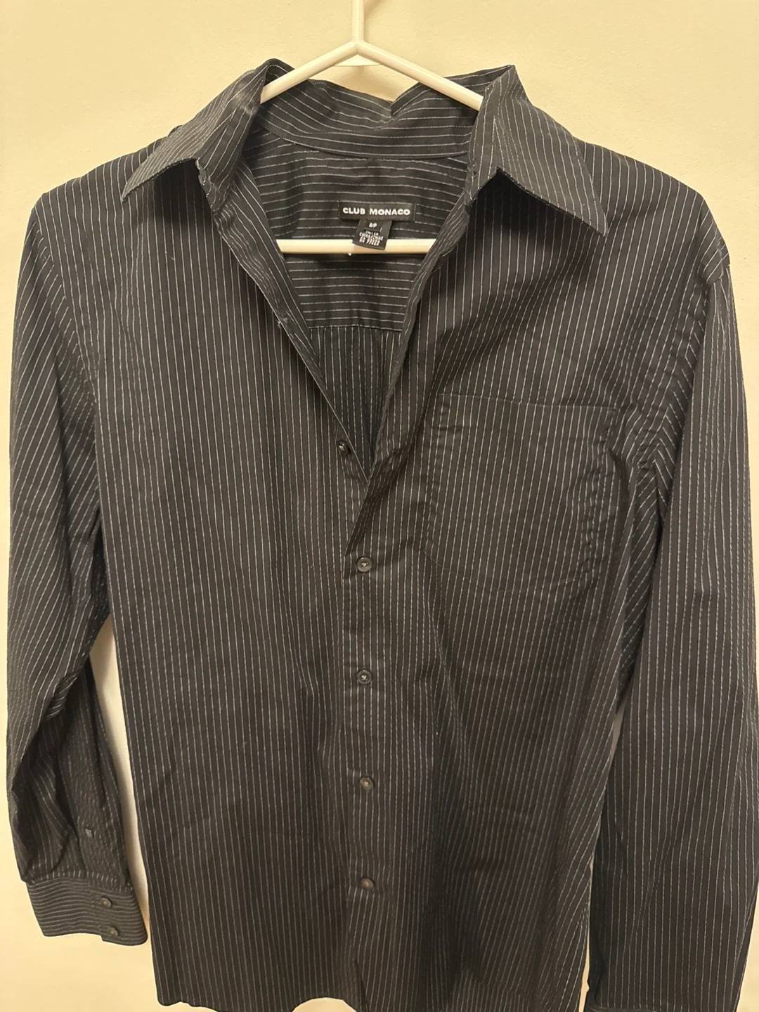Here's a Club Monaco dress shirt in size small. It's a classic black with thin white stripes, perfect for a professional or smart-casual look!