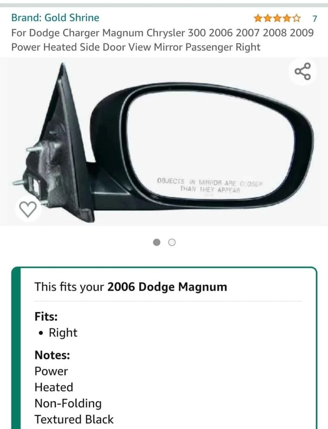 . It's textured black and non-folding. It fits Dodge Charger, Magnum, and Chrysler 300 models from 2006-2009. This mirror is designed for the passenger side. In original box