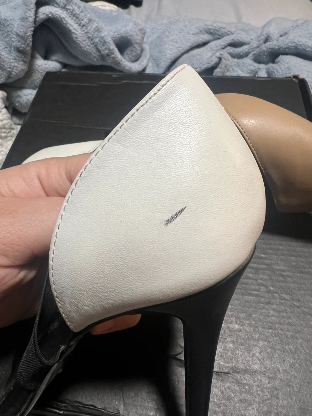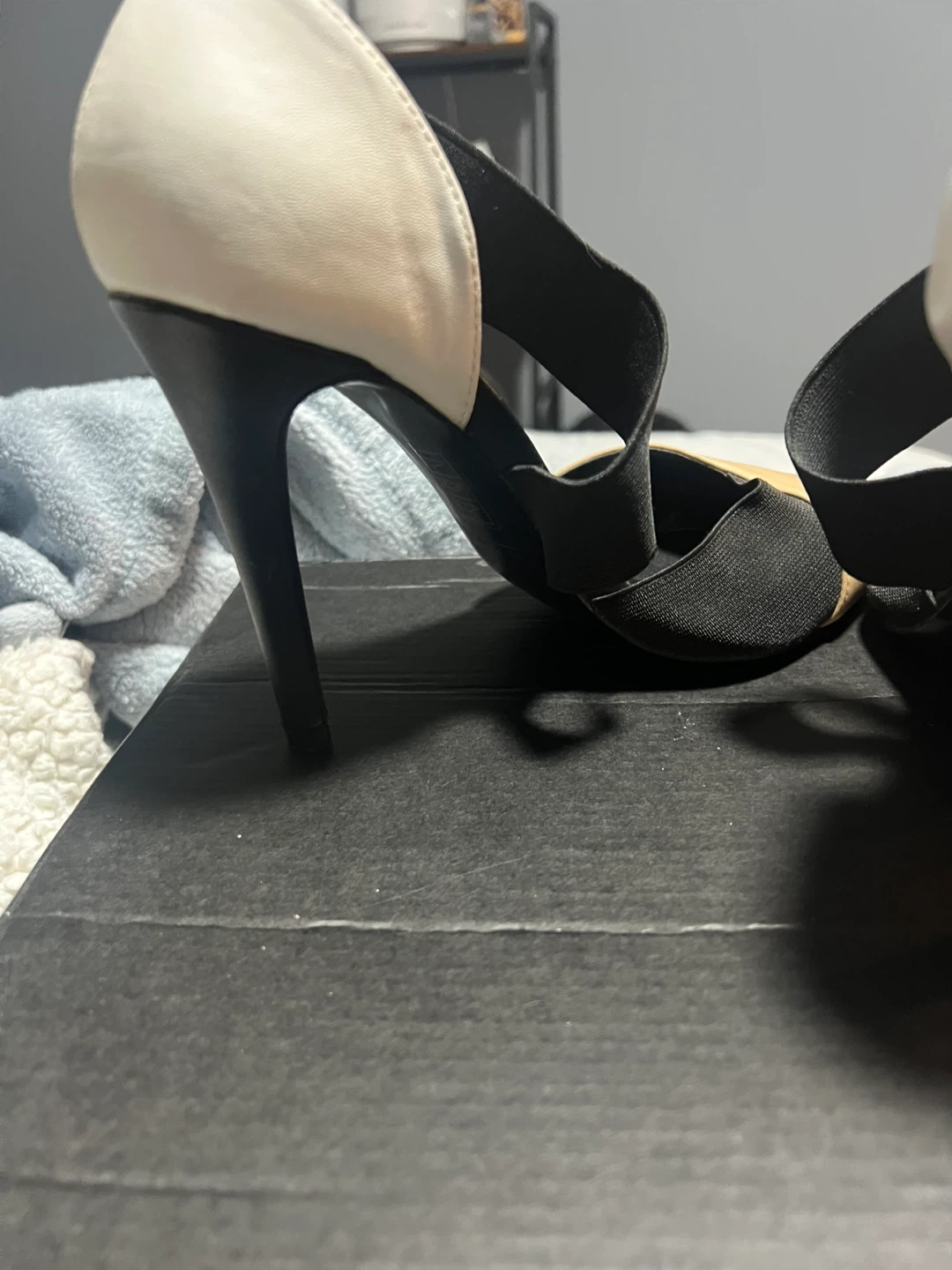 These stylish heels feature a black fabric and faux leather upper with beige and white accents. They have a classic pointed toe and a strappy design. Please note there are minor scuffs on the toe and heel area. Heel height is approximately 3.5 inches.