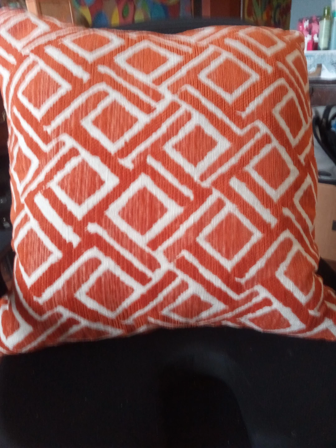 Throw pillow with an orange and white geometric diamond pattern. It's a comfy accent for any sofa or chair. Fabric appears to be textured.