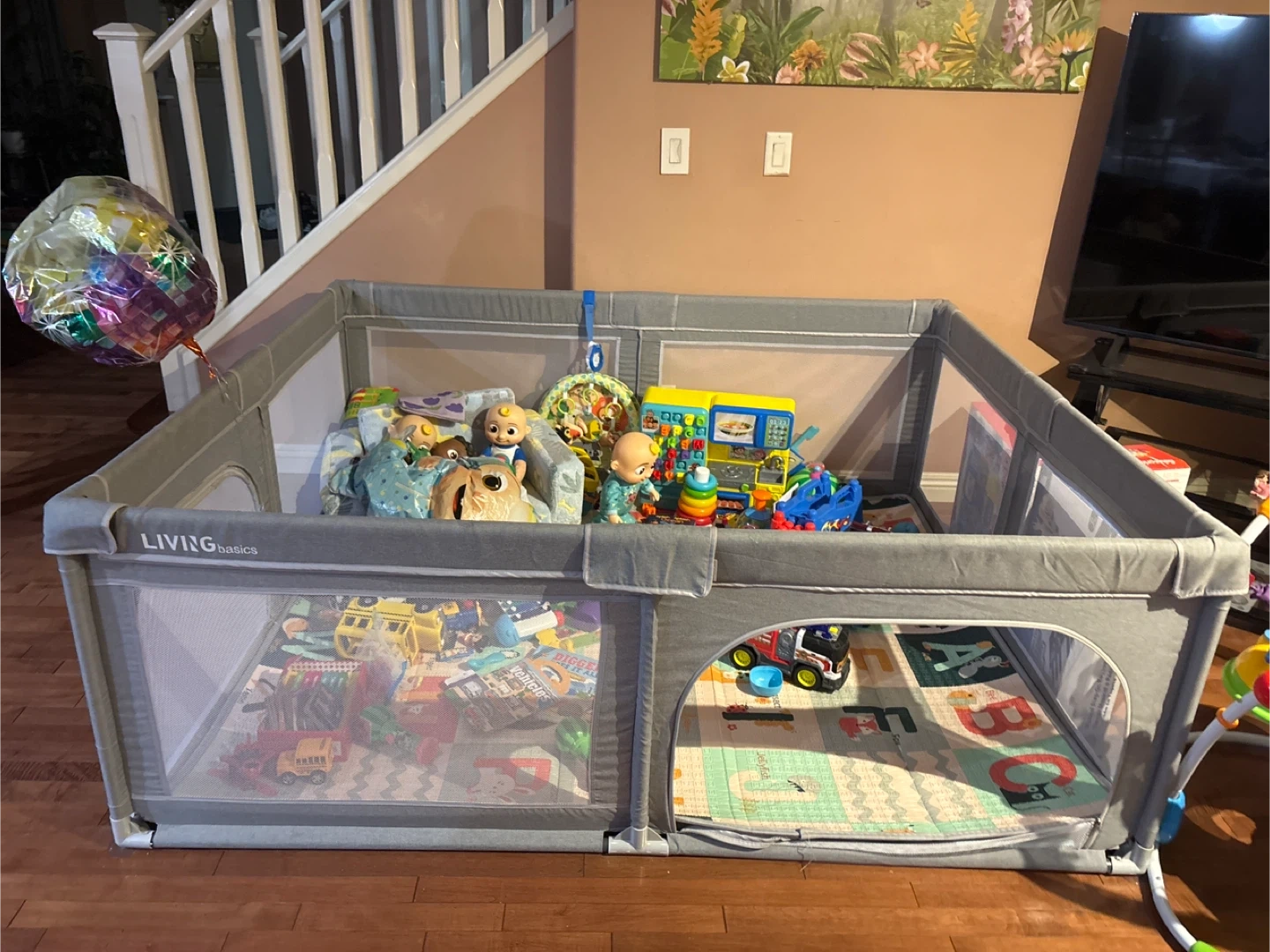 Designed for safety and comfort, this Living Basics playpen is made with grey mesh fabric and offers a generous play space for babies and toddlers. A large mat is included. Toys not included.