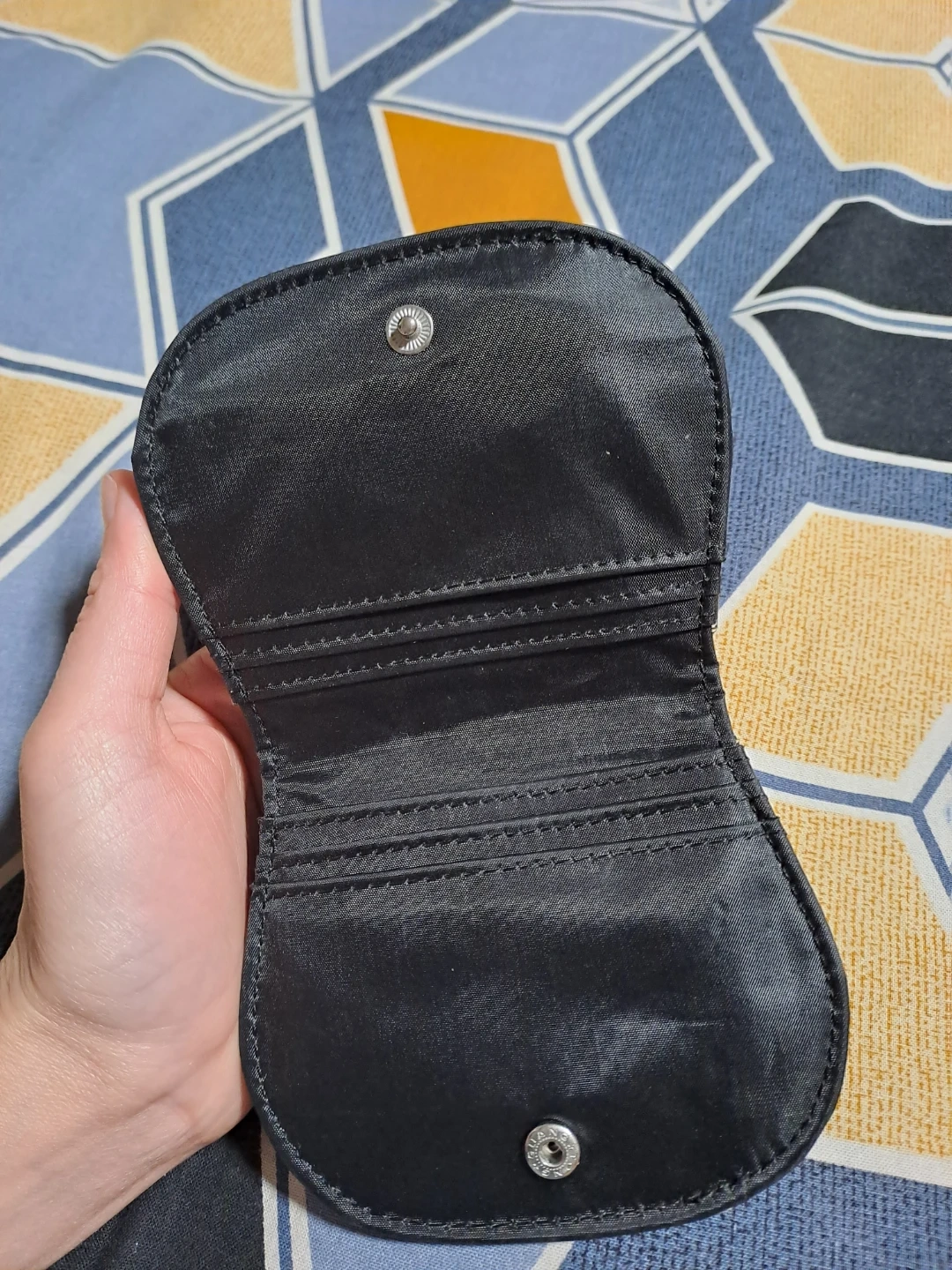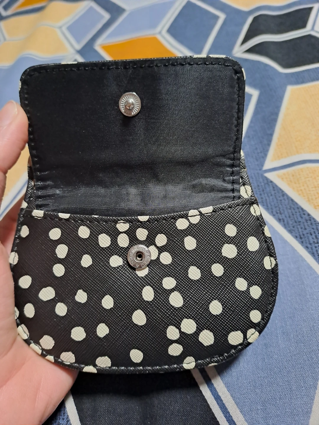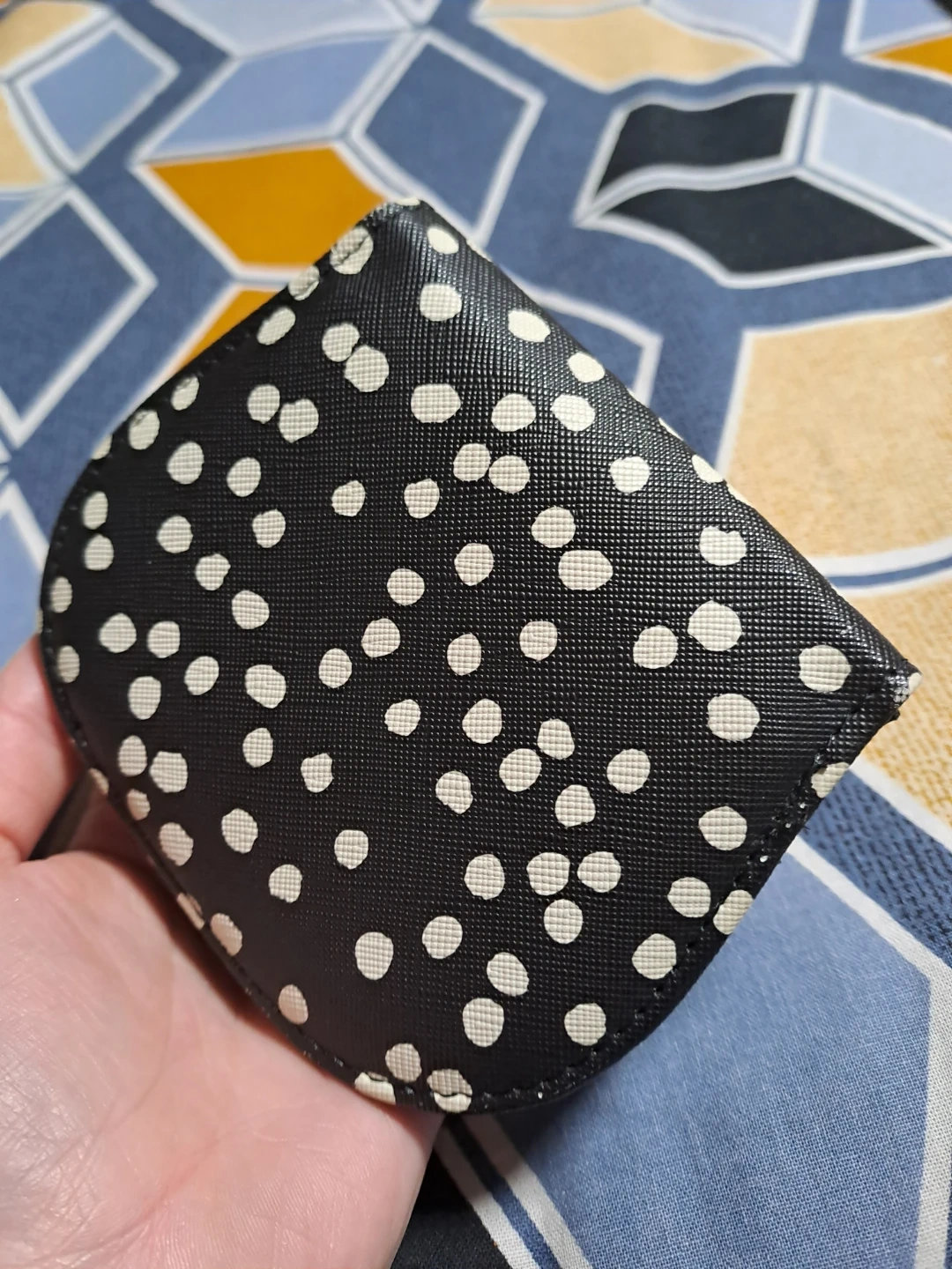 A cute little coin purse with a black and white polka dot exterior. It's made from a durable, faux-leather material. Interior has a few card slots and a snap closure. It's perfect for holding loose change or cards!