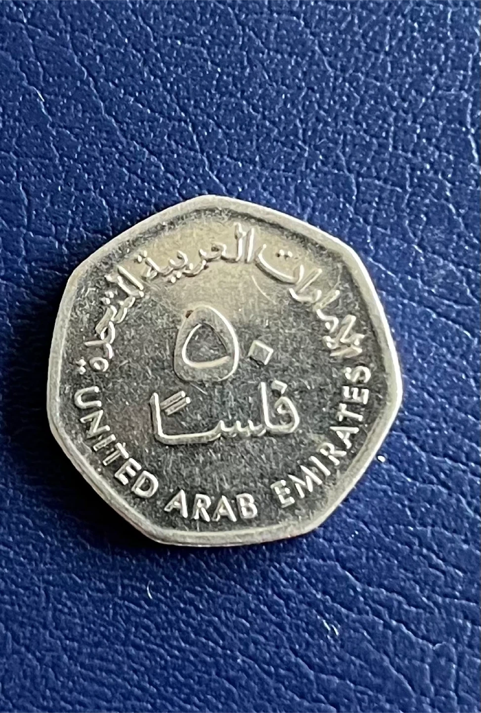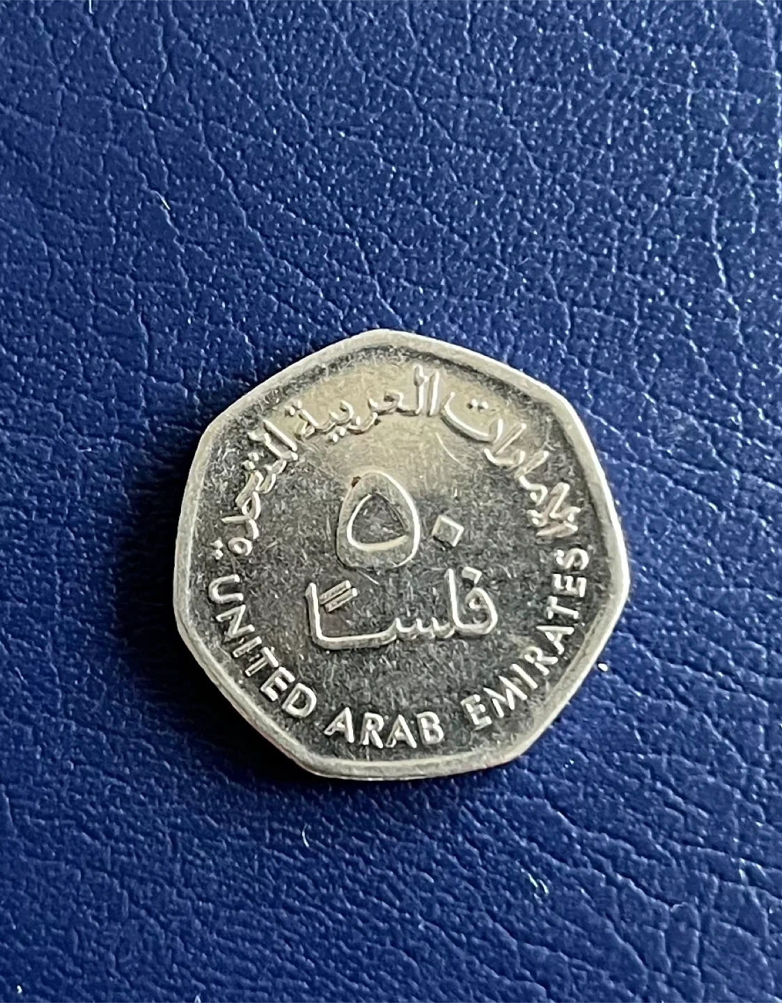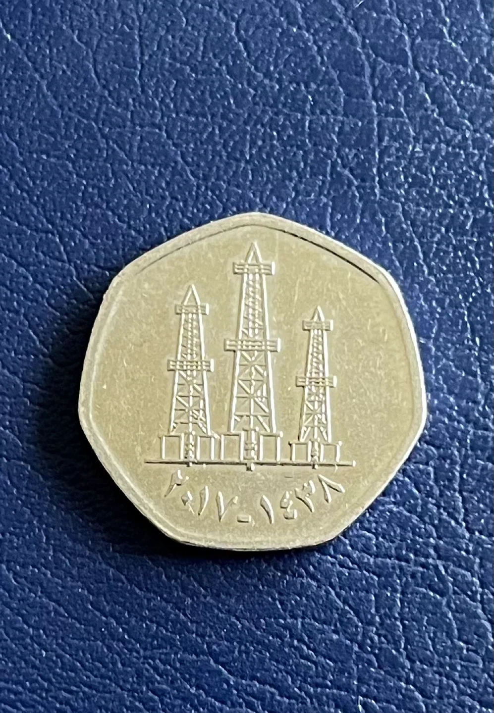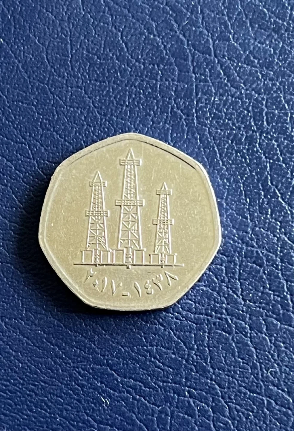 This is a 50 fils coin from the United Arab Emirates. It features oil rigs on one side and Arabic text along with "UNITED ARAB EMIRATES 50 FILS" on the other. A neat piece for collectors!