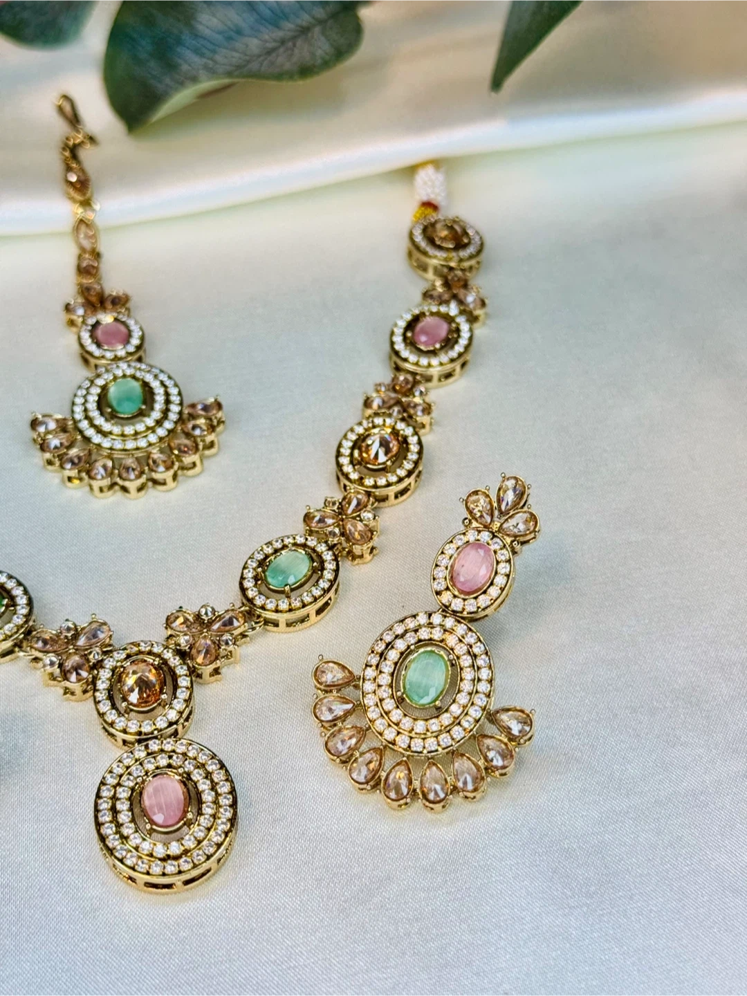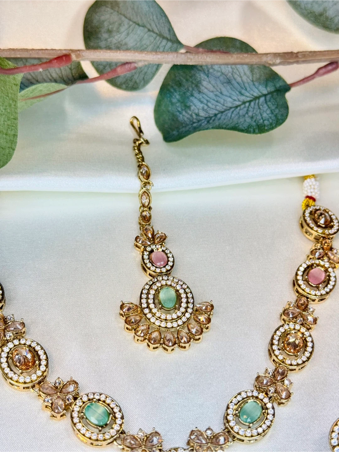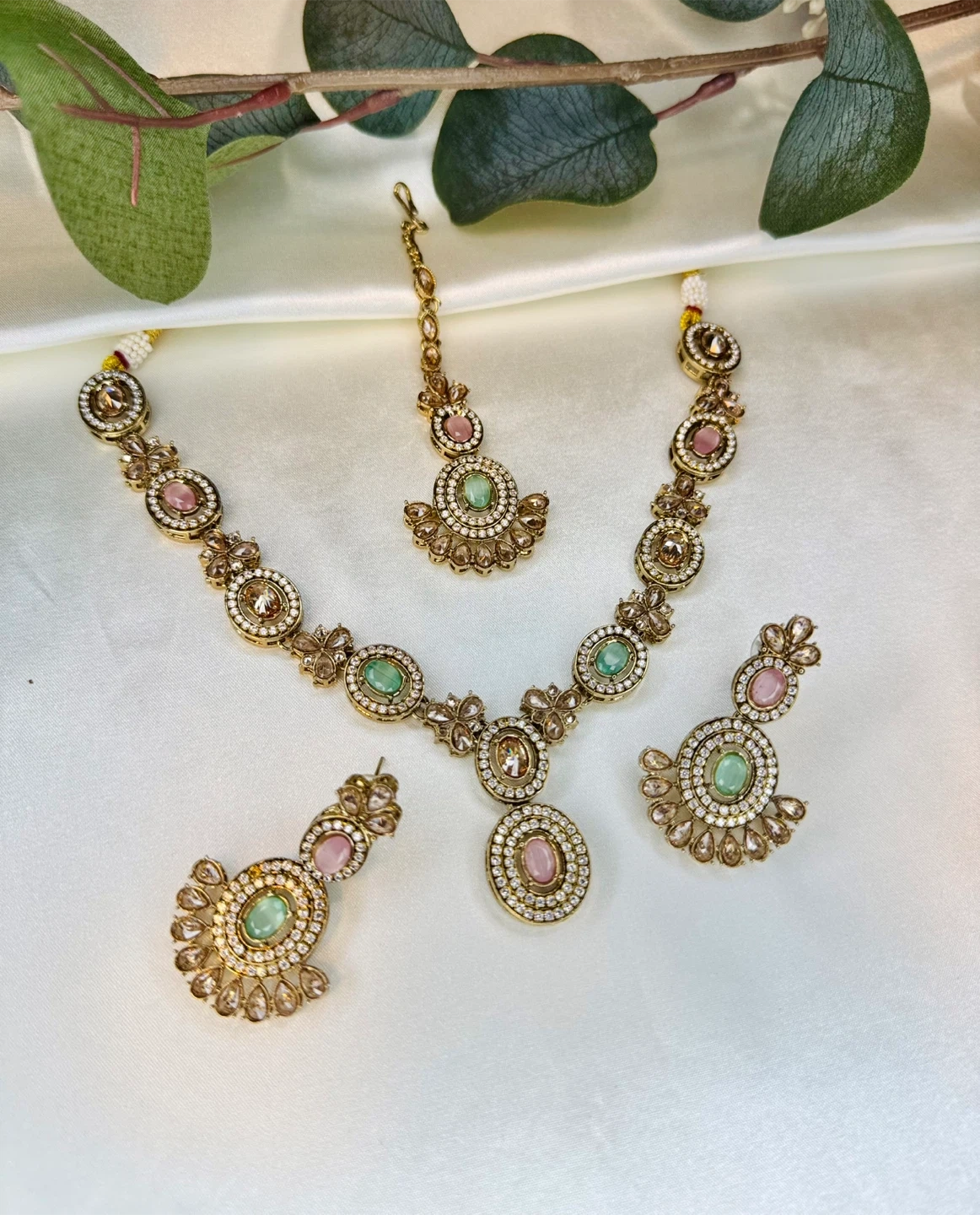 This elegant jewelry set includes a necklace, earrings, and a tikka. It's adorned with faux diamonds and features delicate pink and green oval stones. The gold-tone metal gives it a classic look, perfect for special occasions!
